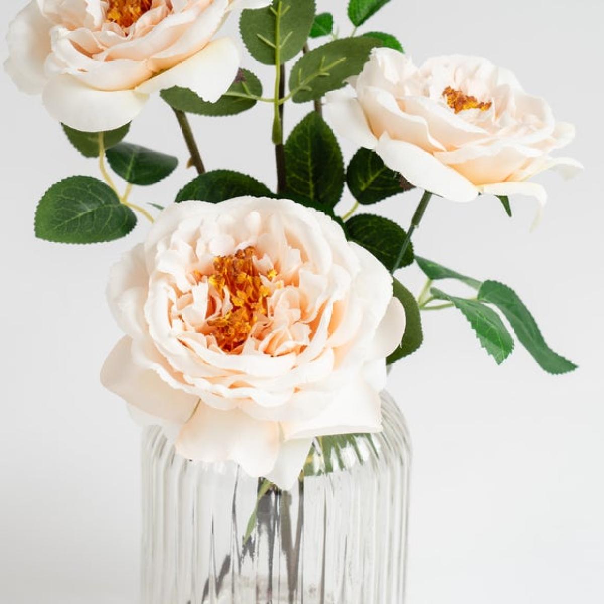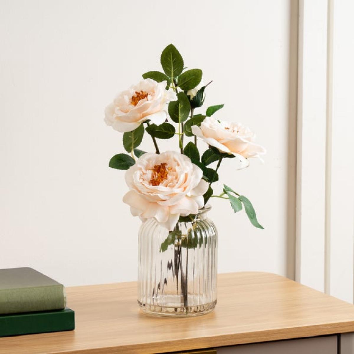 I love this faux blush pink rose arrangement because it adds a soft touch of colour and elegance without the maintenance of real blooms. It's versatile enough to suit a range of interiors, from romantic and shabby chic to modern minimalist spaces. The ribbed glass vase offers a subtle, tactile texture that elevates the display. For styling tips, I’d recommend placing it on a side table or mantel to bring a gentle colour pop, pairing it with neutral-toned accessories for a cohesive look. It’s perfect for adding a touch of freshness to bedrooms, living rooms, or even bathrooms, whenever you want a pretty, fuss-free floral accent.