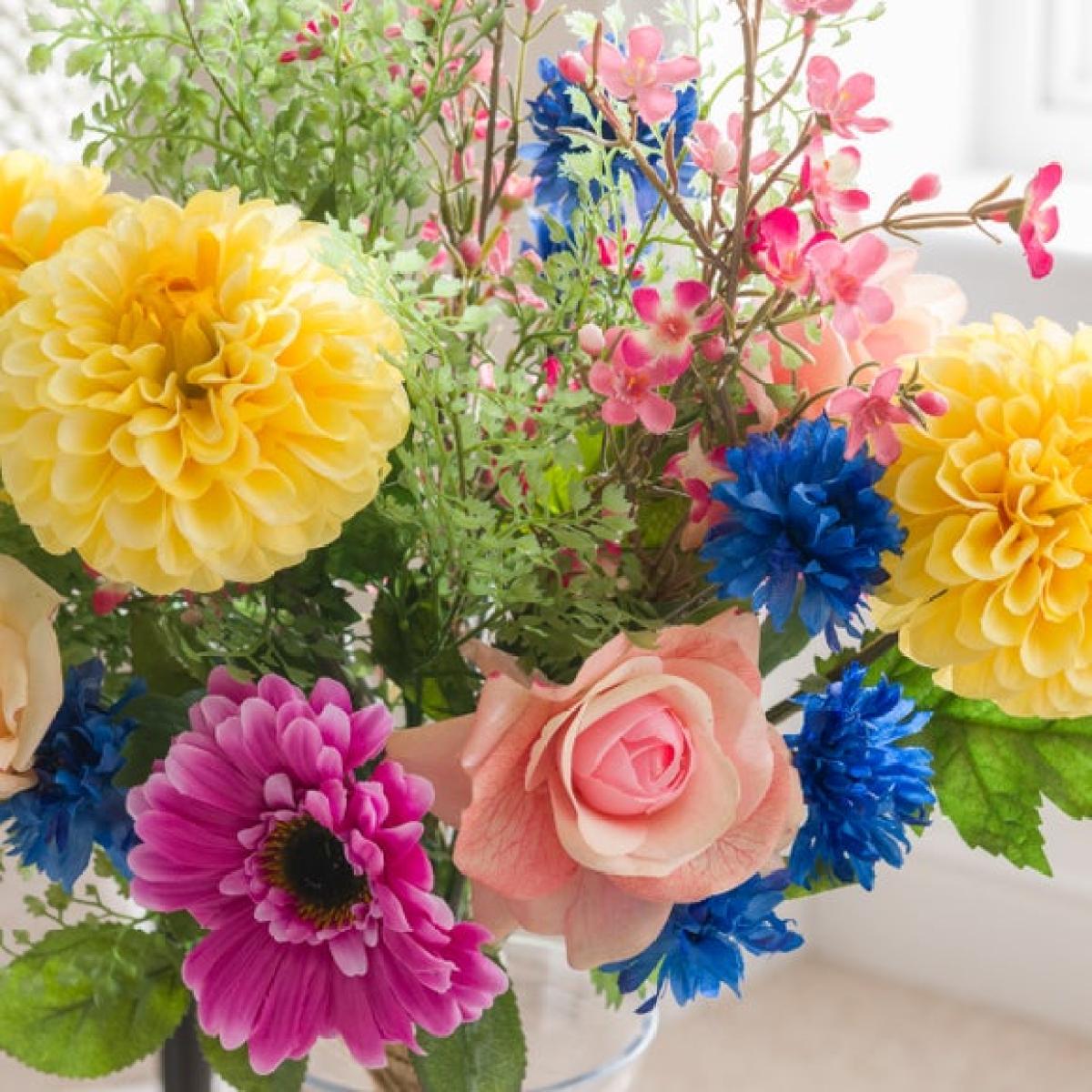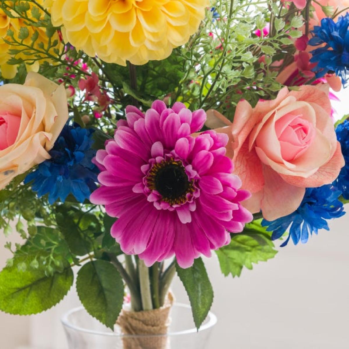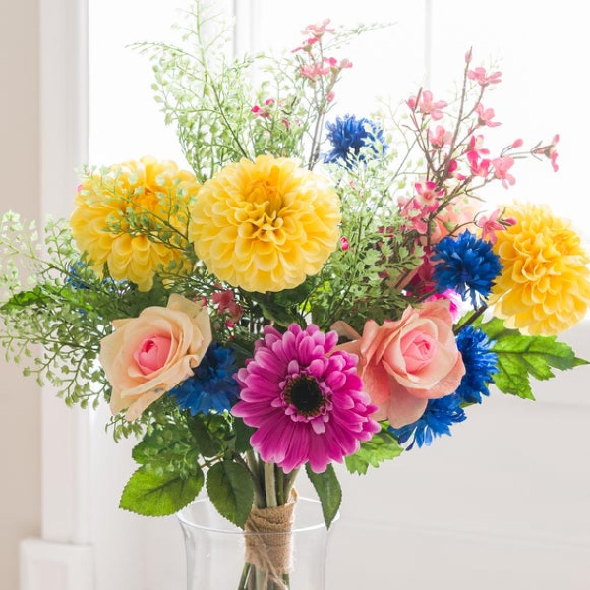 * Artificial bouquet * Realistic blooms * Mix of flower types * Vase not included Bring instant cheer to your space with this vibrant hand-tied bouquet. Featuring a joyful mix of roses, dahlias, gerberas, waxflowers, cornflowers and maidenhair ferns, it’s bursting with bold colour and lifelike detail. No maintenance needed – simply pop it in your favourite vase and enjoy year-round beauty. A lovely statement for your home or a heartfelt gift to brighten someone’s day.