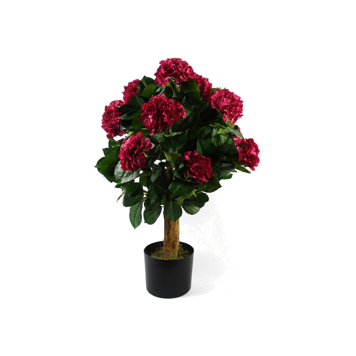 High quality artificial hydrangea bush. This bush contains multiple high grade silk flowers as well as an extra thick natural wood trunk - this plant is absolutely beautiful. Branches are wired and can be arranged to suit your space. Due to the delicate silk flowers we wouldn't recommend this is used outside. Plastic weighted pot measures 18cm (d) x 14cm (h) approx. Potted in a plain plastic pot and is ready to display. You can make these trees look all the more impressive by popping inside a larger planter and covering with soil- bark or gravel to add to the realistic effect. Genuine Leaf Design UK Product.