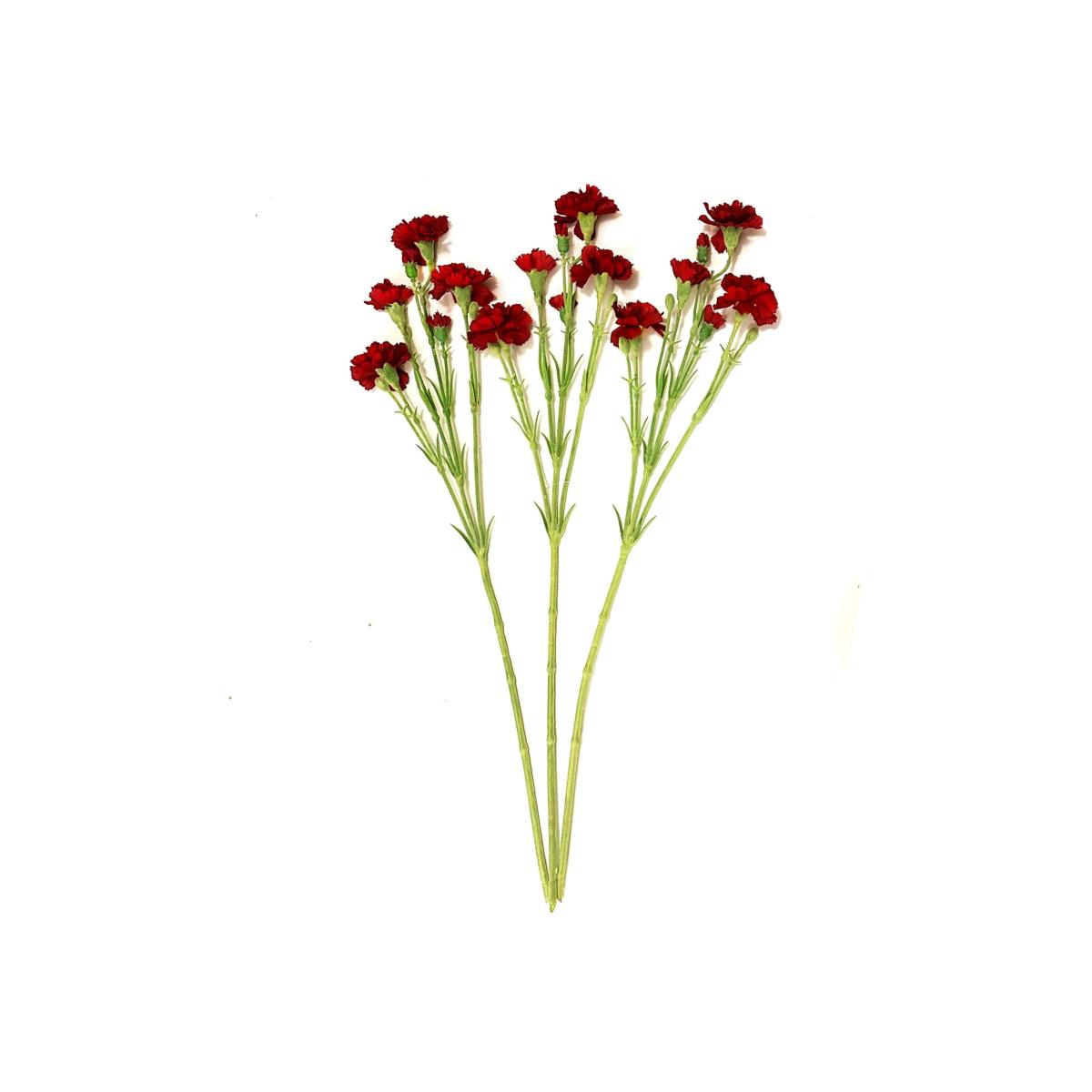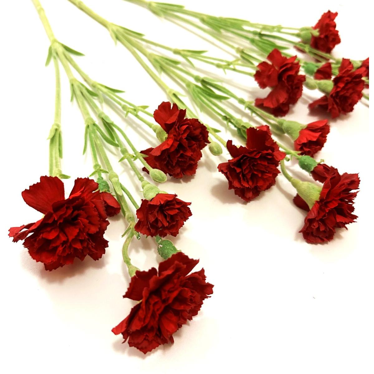 These Carnation stems have red flowers on a long pale green stem. Six flowers per stem at various stages of the growing cycle and three flower buds. Spray carnations are a great filler flower for adding texture and bulking out a floral display. The petals are soft touch and stems have a flocked real feel.