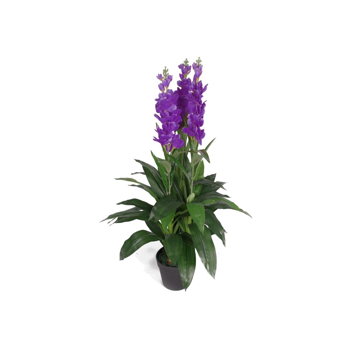 A bold and visually striking artificial plant- this replica Cymbidium Orchid looks fantastic as a table centrepiece or windowsill display. With bright colours offset by deep green realistic leaves, it is both vibrant and beautiful. This artificial plant stands 100cm high when arranged as shown in the pictures. The colour is purple - we have several colour variations of this plant available- see our other products. Stems are wired so this can be arranged to fit your space perfectly. It is highly realistic with botanically accurate foliage. It comes potted in a plain plastic pot and is ready to display. You can easily put this inside a larger planter if you wish.