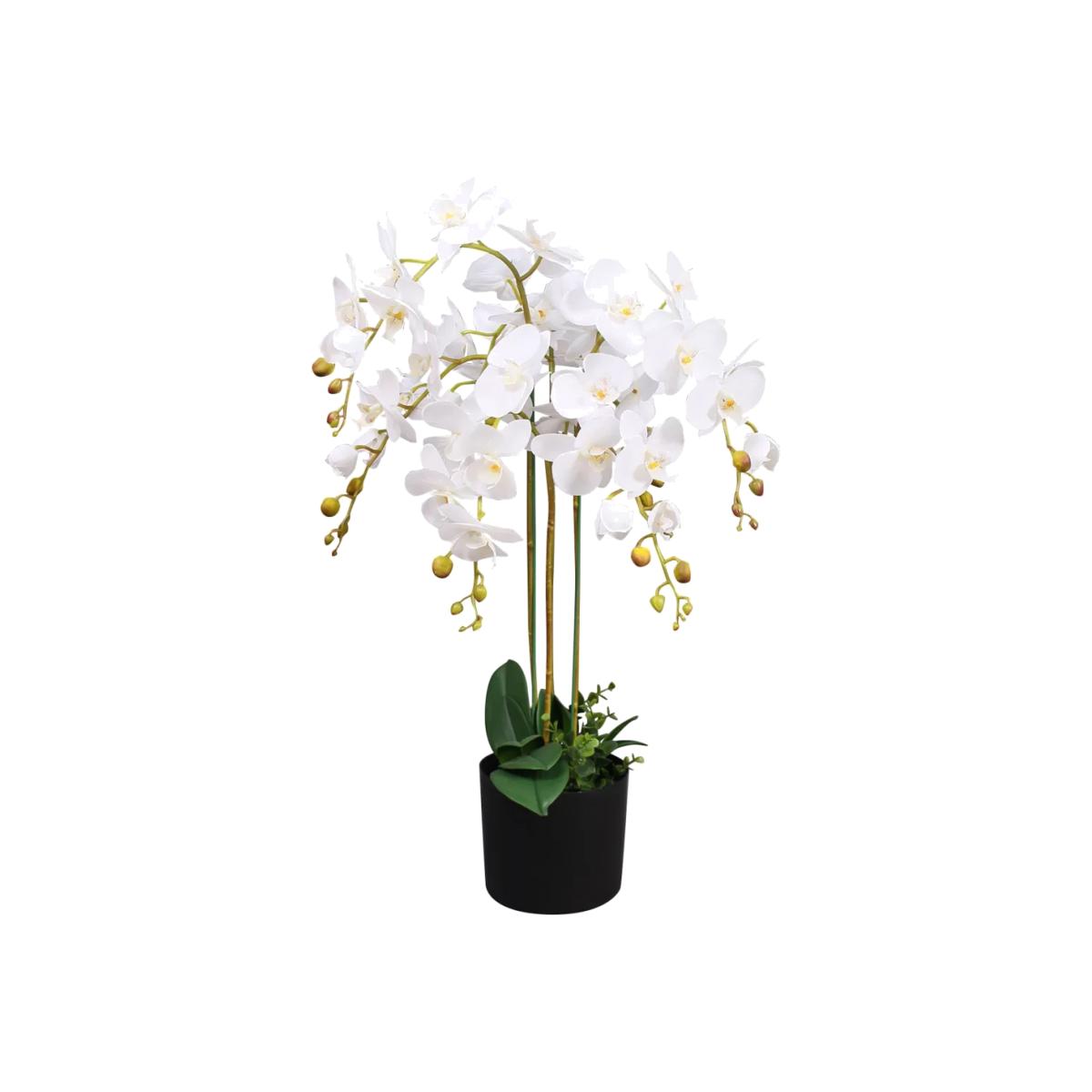 Our artificial bush orchid makes a fabulous table decoration. It is a very large flowering plant with amazing attention to detail. Large white flowers. 9 Leaves- 56 flowers. Incredible attention to detail. Comes potted in a plain black plastic pot but this can be put straight into a larger planter for a more impressive effect.