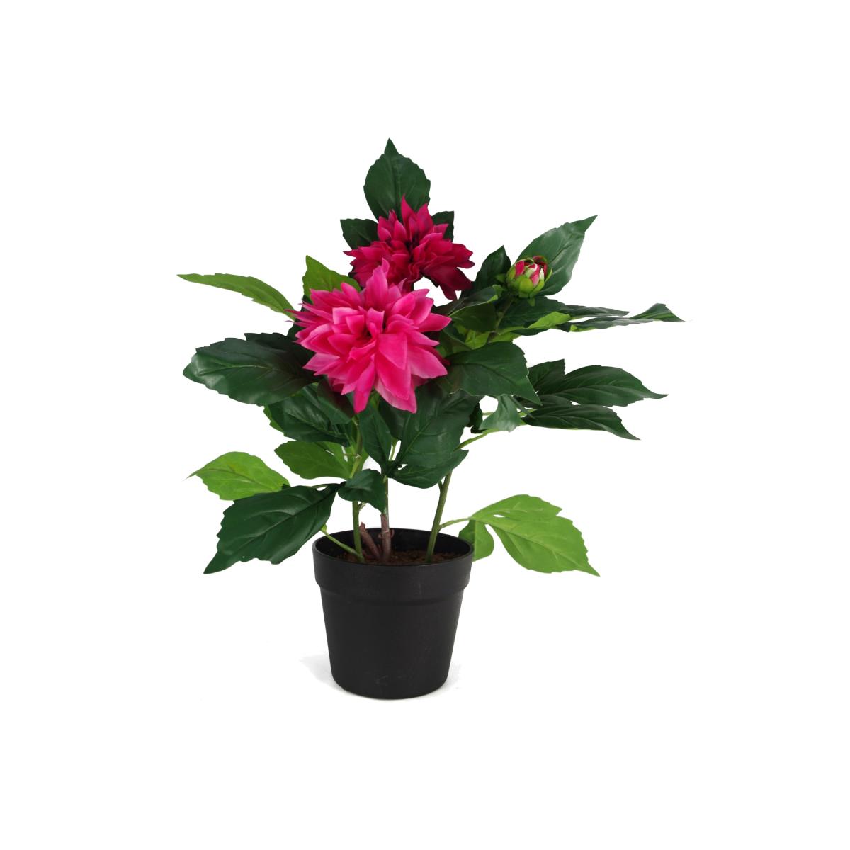 Potted Dhalia with 2 flowers, 1 bud and 20 leaves potted in a black plastic pot with fake soil. This product is designed for indoor use only. Petals and leaves are fabric. Stems are wired and can be arranged. Petals and leaves are fabric. Stems are wired and can be arranged.