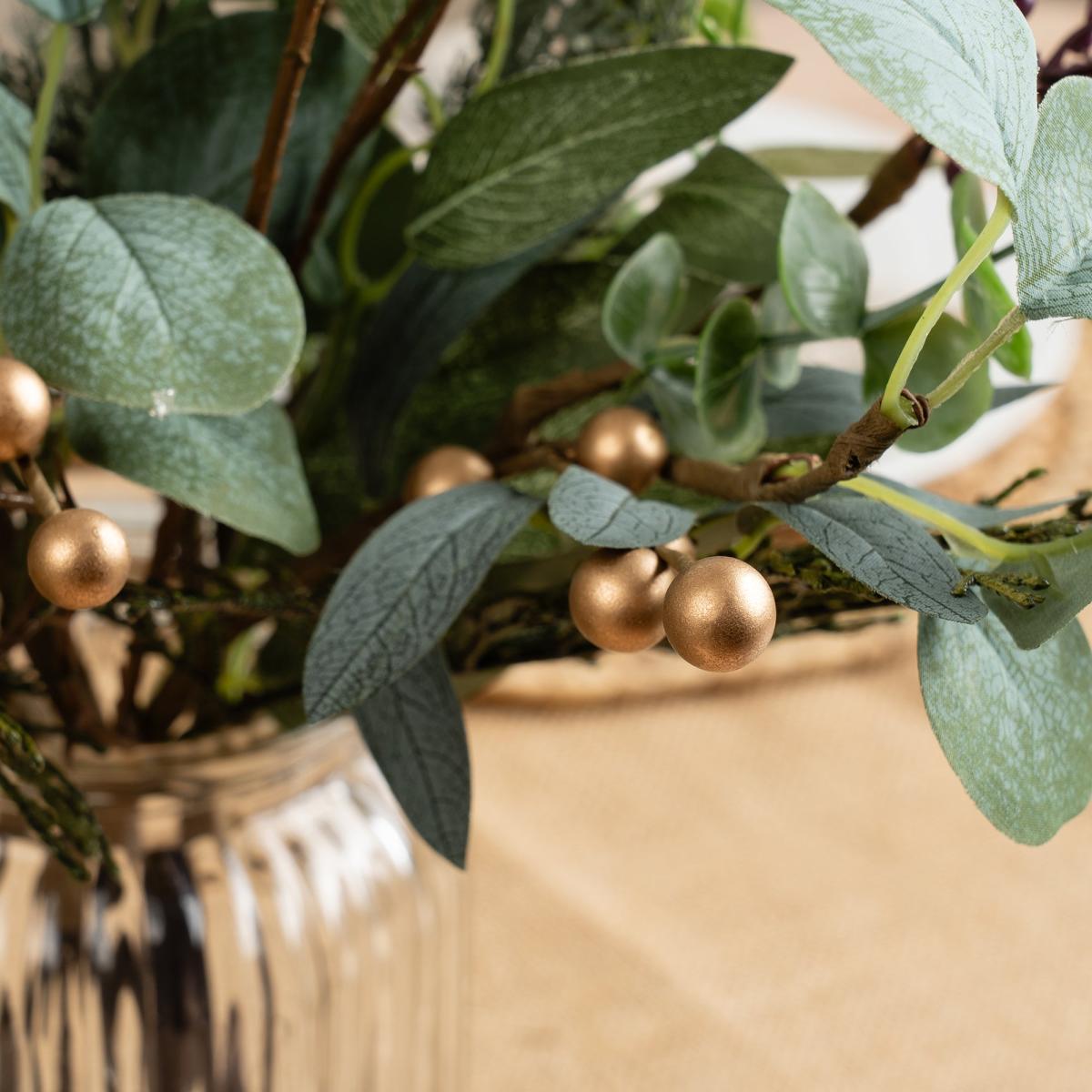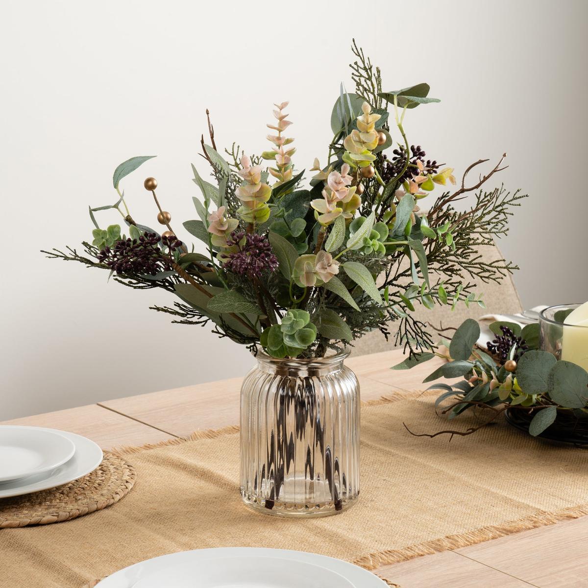 * Complete with vase* 30cm tall* Rustic eucalyptus arrangement* Coordinating items available This artificial eucalyptus arrangement will lend a touch of natural elegance to your home. Complete with clear ribbed glass vase, this arrangement is ready to place wherever you would like a rustic and stylish look. Faux water in the vase adds realism, making it look like freshly cut eucalyptus straight from the garden, and matching items such as a wreath or garland will bring cohesion to your space.