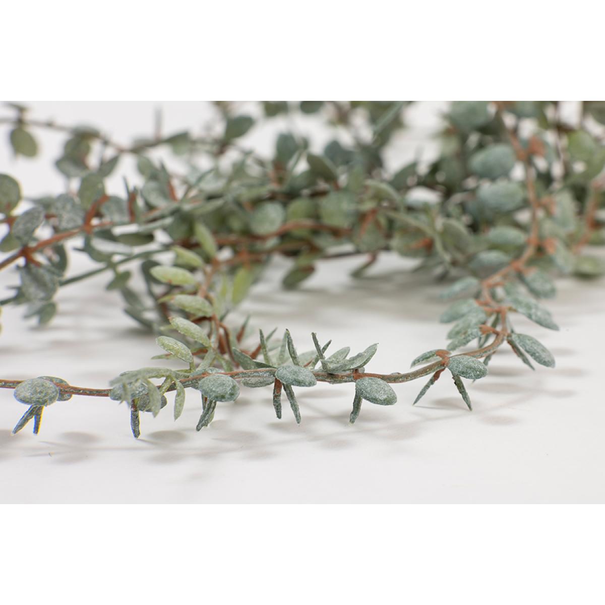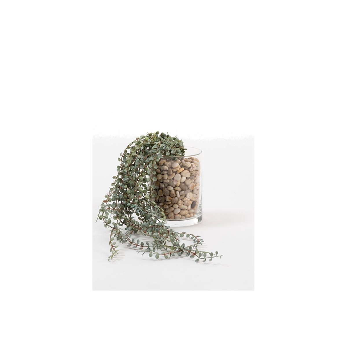 A pretty and delicate artificial trailing Eucalyptus Vine. Realistic-looking high-quality reproduction. Ideal for draping off shelves or in a hanging basket. Vase and pebbles are for display purposes only and are not included.