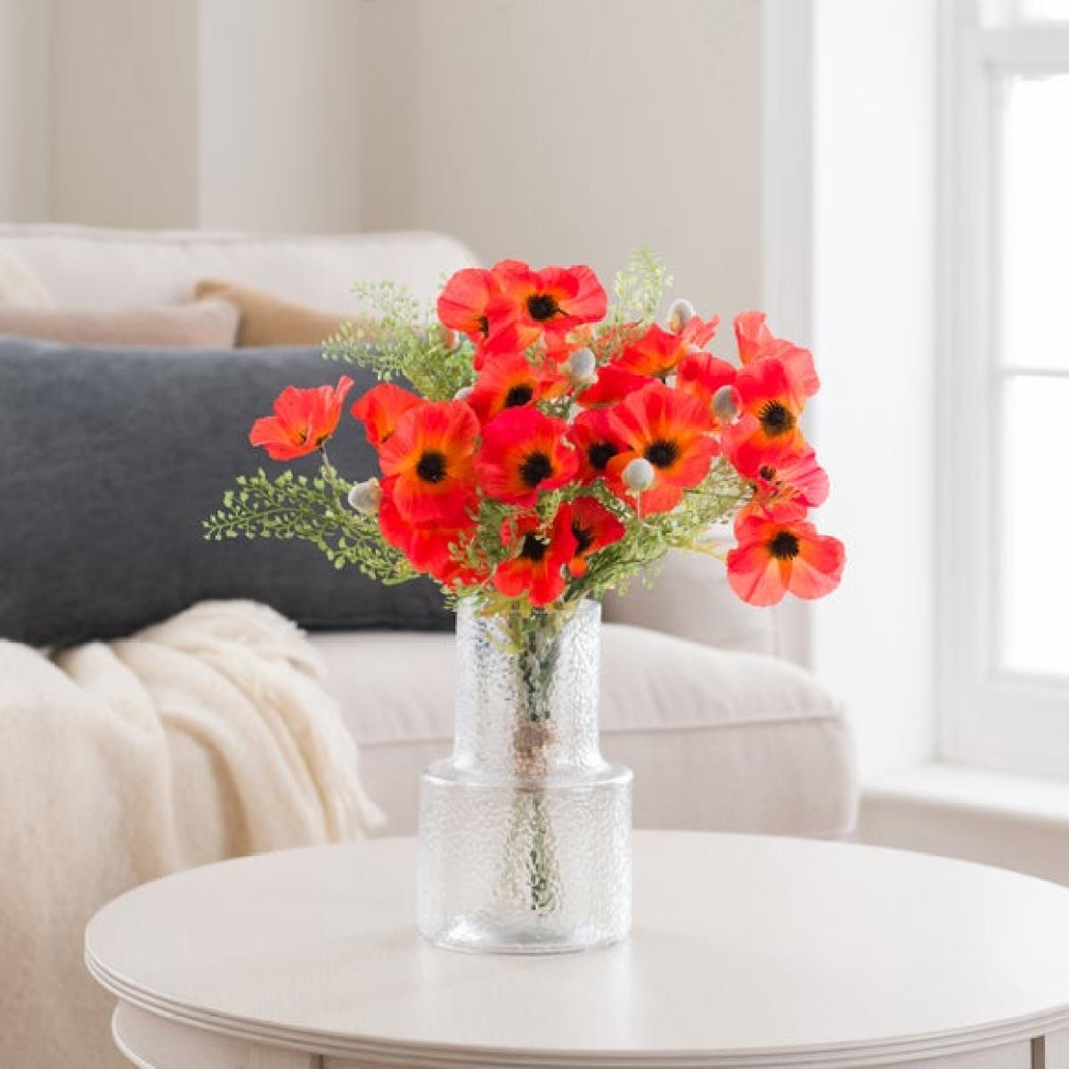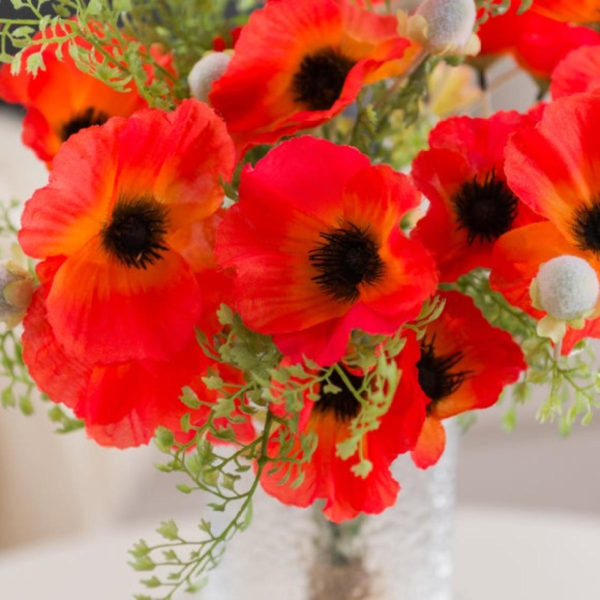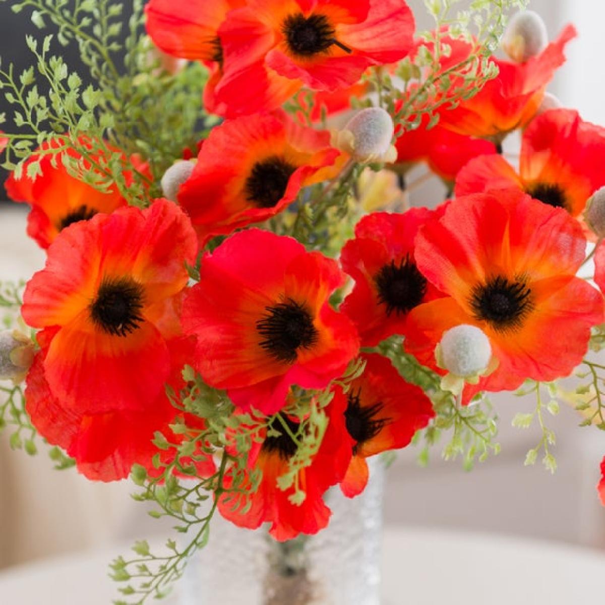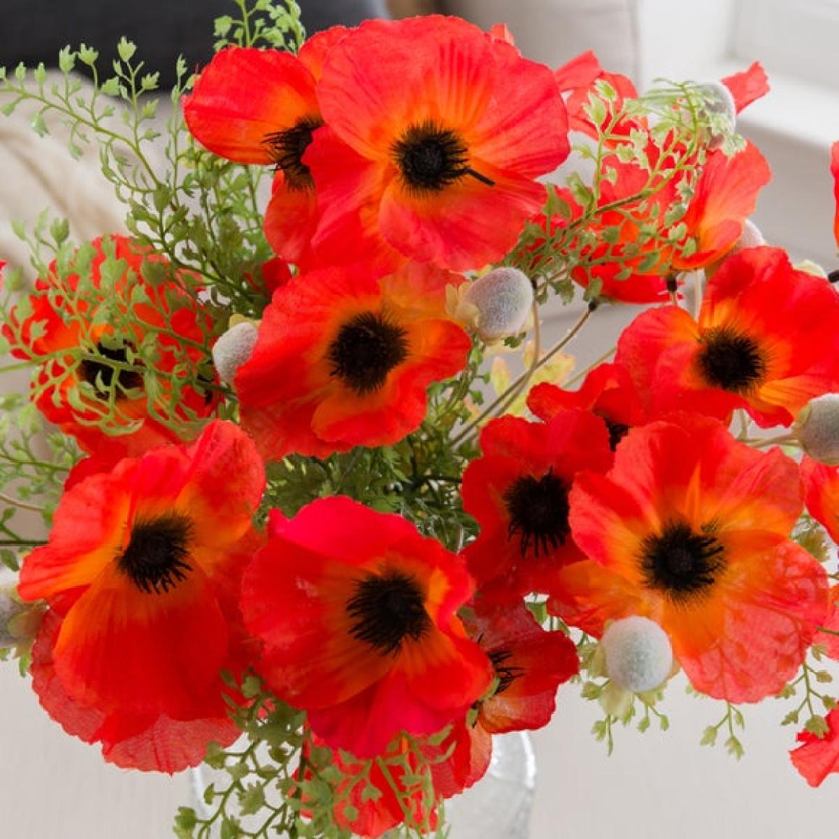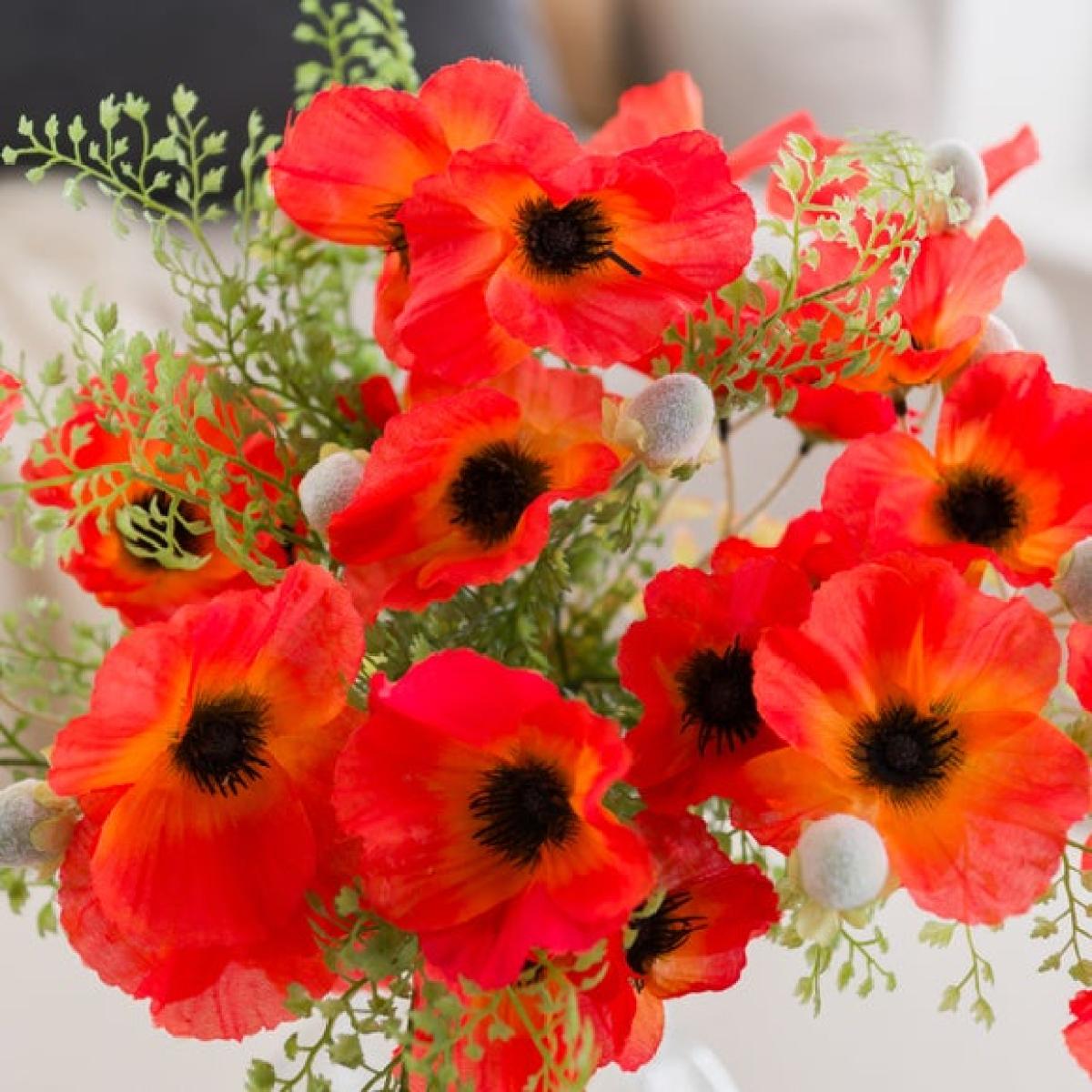 * Vibrant red poppies & lush ferns * Hand‑tied and ready to display * Bold, timeless look * Realistic, long‑lasting blooms * Perfect for gifting Bring classic colour to your space with this beautifully hand‑tied bouquet of vibrant red poppies and airy ferns. Pre‑arranged for effortless styling in your favourite vase (not included), it brings instant impact. Lifelike petals and layered greenery create a full, fresh look that lasts without any upkeep. A thoughtful gift or an easy way to add colour to living rooms, hallways or bedside tables all year round.