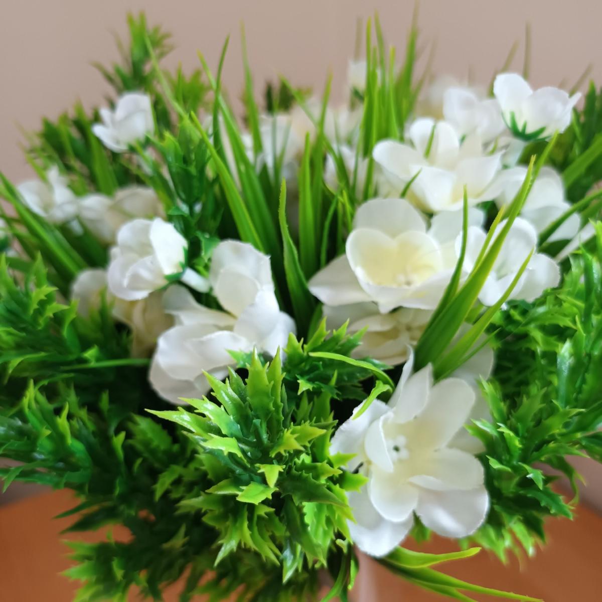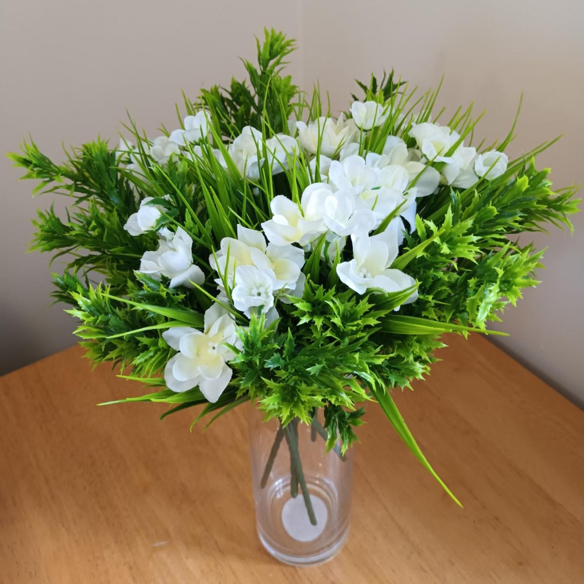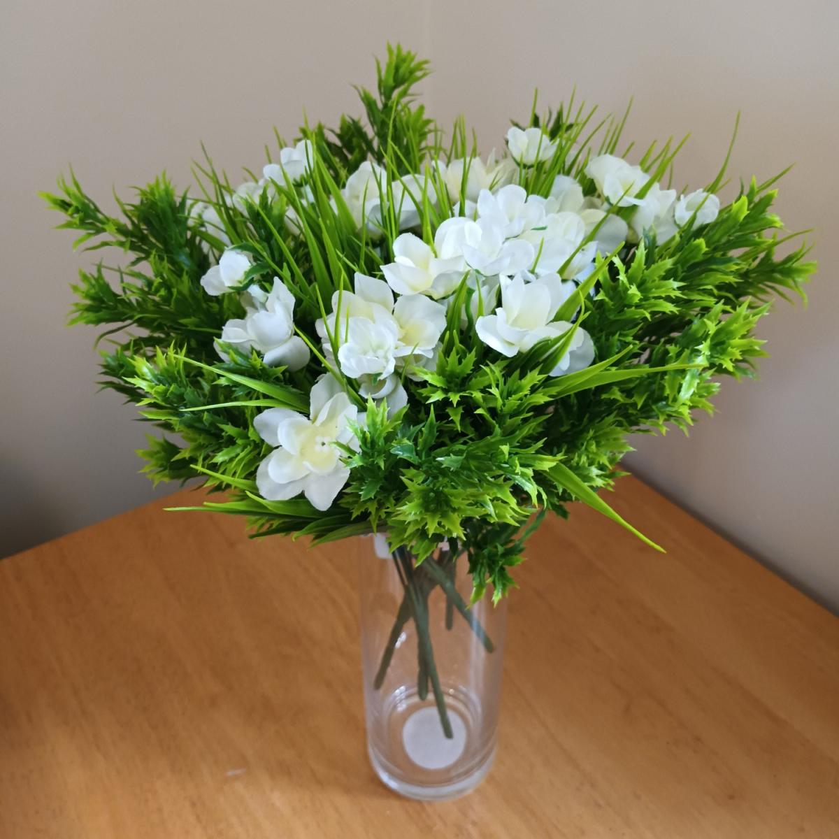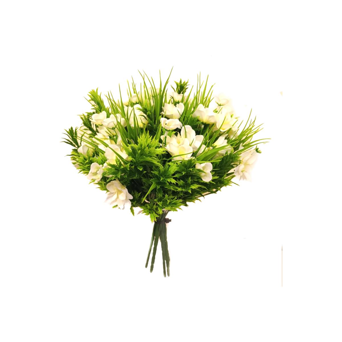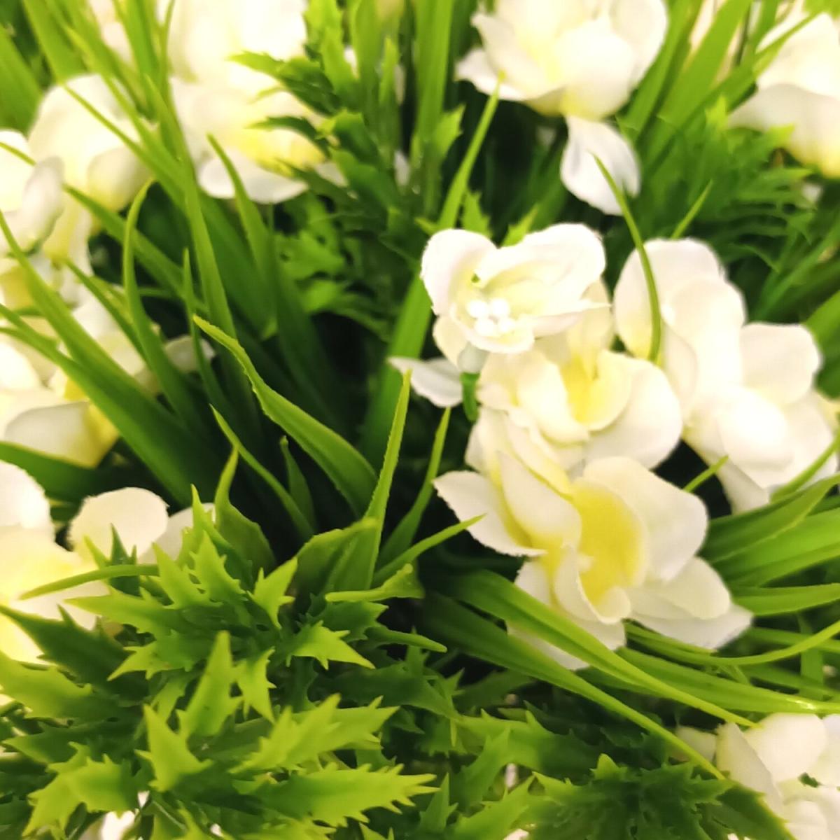 A lovely arrangement of Artificial Sword Grass with white flowers, mixed with the little spiky leaves of the Mini Ilex bushes. This arrangement includes 3 of the Sword Grass Bushes and 3 of the Mini Ilex bushes. Perfect for brightening up the home, office, or shop window or as decorations for weddings and other special events. These artificial plants are made from the highest quality materials and will make great flower arrangements for years.