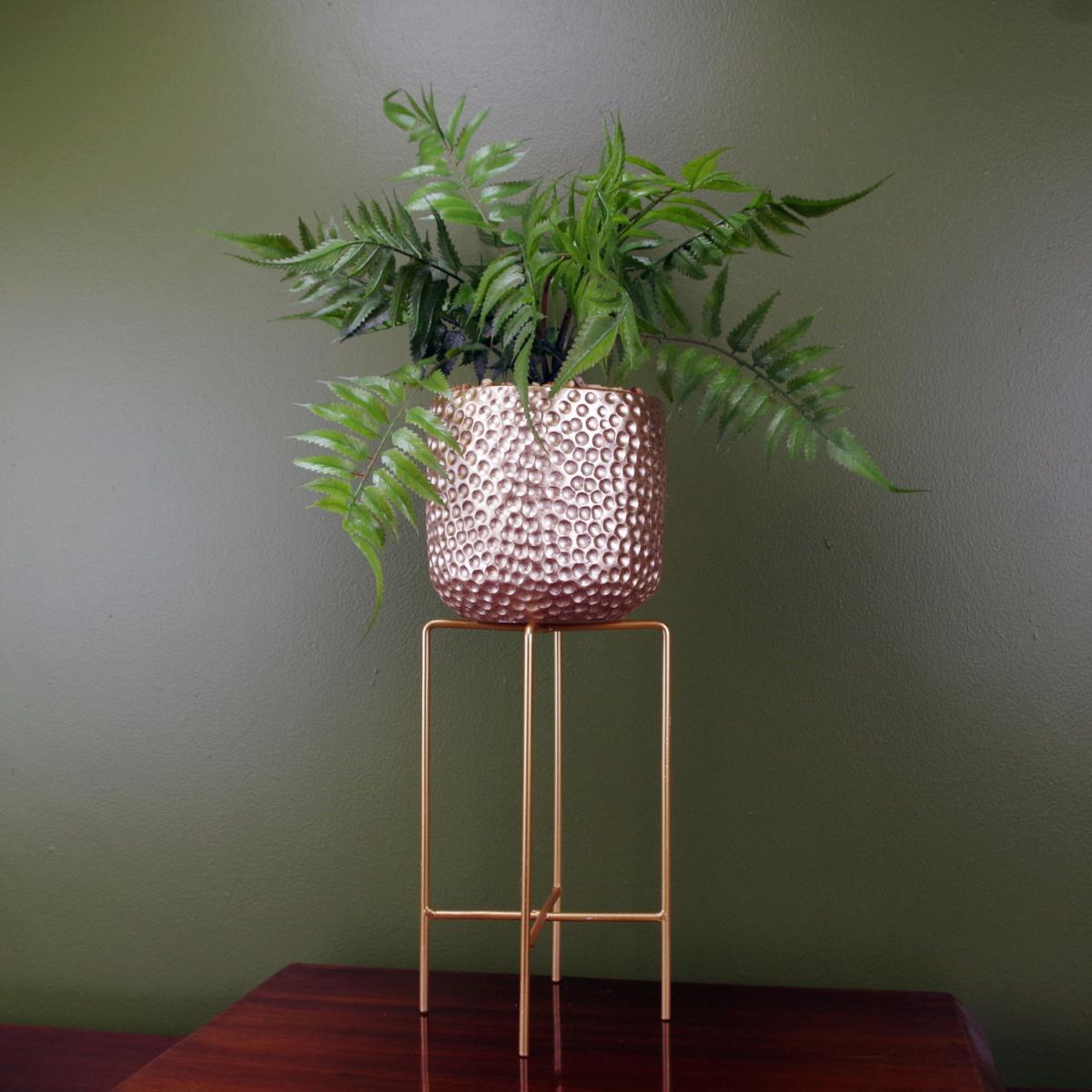 Artificial fern plant potted in planter with metal stand. Realistic fern in a decorative ceramic planter with metal stand- ready to display straight out of the box. Leaves have individually shaped fronds. The stems are wired and the leaves can be shaped to fit your space.. The decorative ceramic gold planter.. The leaves are plastic. The ceramic decorative planter is topped with fixed pebbles for an attractive- low maintenance finish. The planter and stand are two separate items and can be used together or separately- they are not fixed.