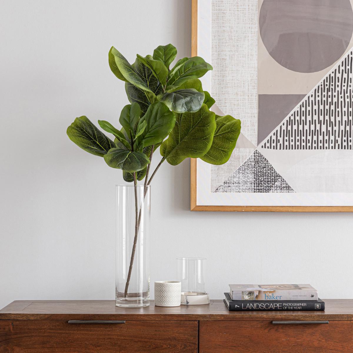 I absolutely love this artificial fiddle leaf spray; it adds instant greenery without the maintenance of real plants. Its vibrant green tone and realistic texture make it versatile for various interiors, from modern minimalist spaces to cosy boho settings. It works particularly well in corners, as centrepieces in glass vases, or layered within mixed floral arrangements to bring a touch of lushness. For styling tips, consider grouping a few sprays together in a tall vase for impact or pairing with other neutral-toned natural elements to keep the look fresh and contemporary. It's a practical choice that offers enduring colour and style, making it perfect for those who want greenery without the fuss.