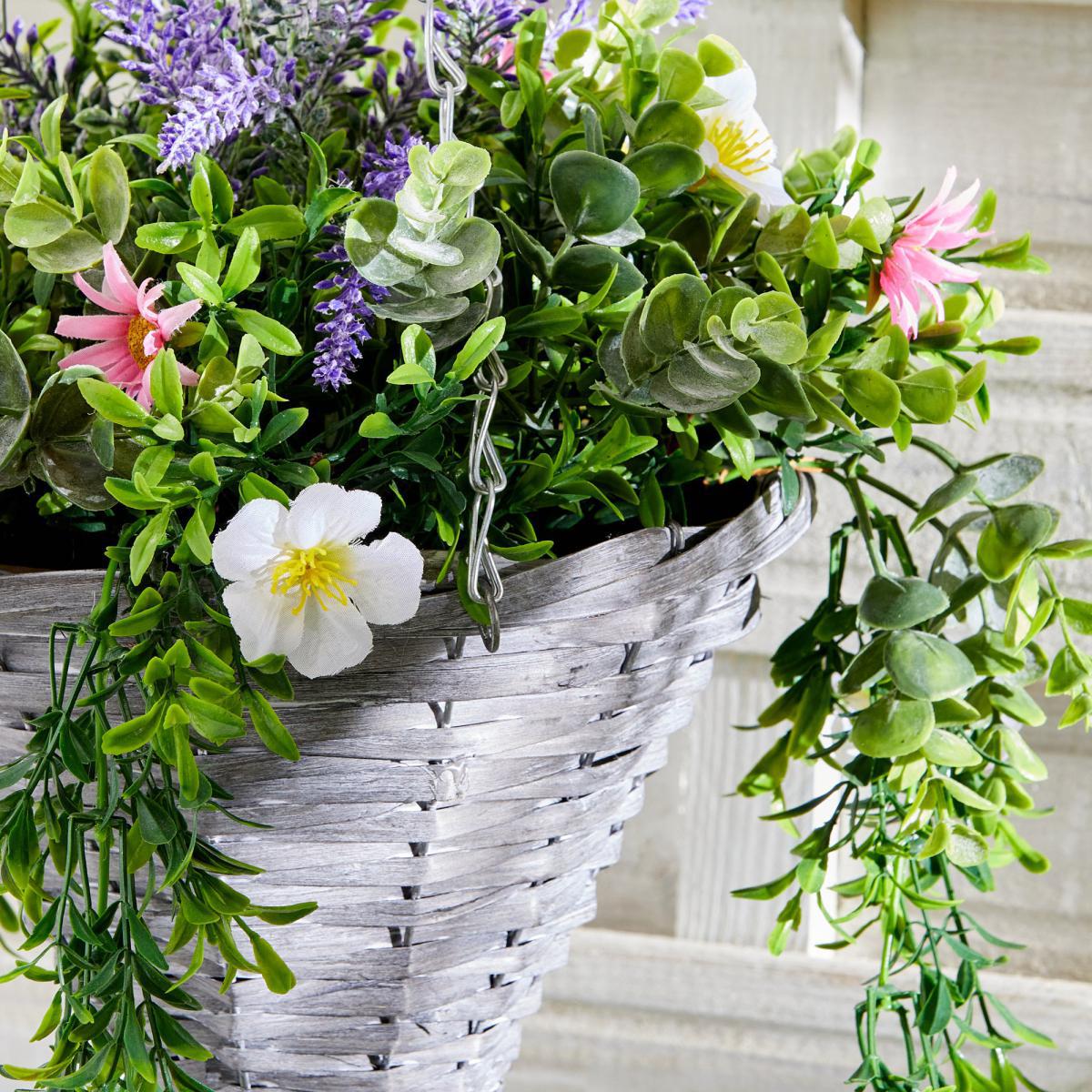 Boasting beautiful artificial flowers this hanging basket is perfect for adding a touch of colour to the outside of your home. Featuring artificial plants and a modern grey coned shaped basket this hanging basket requires no maintenance, making it a stylish and stress free addition to your home.