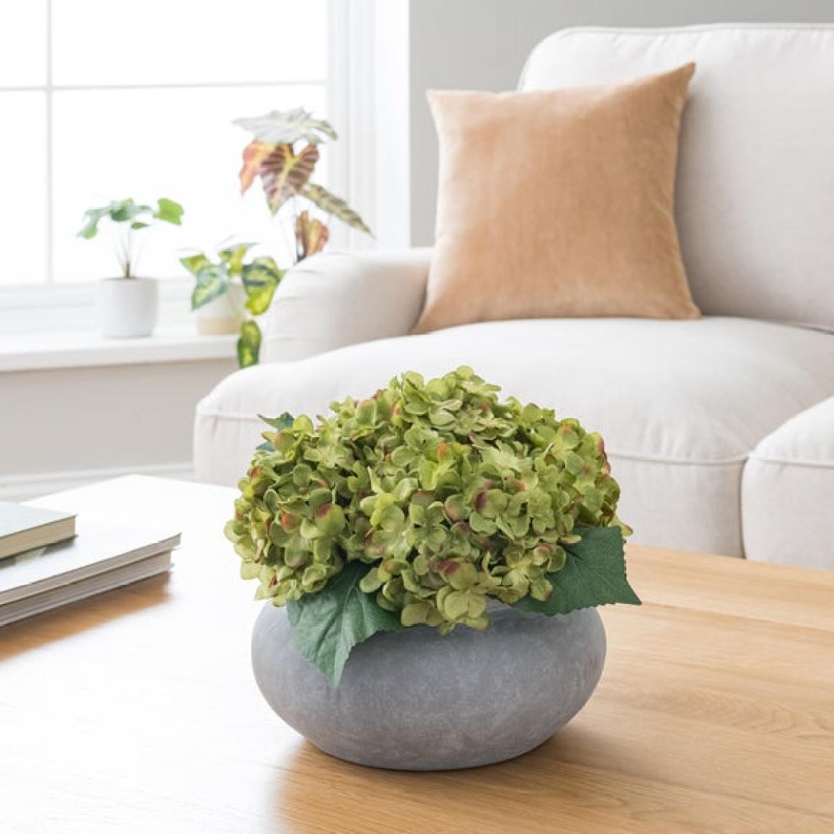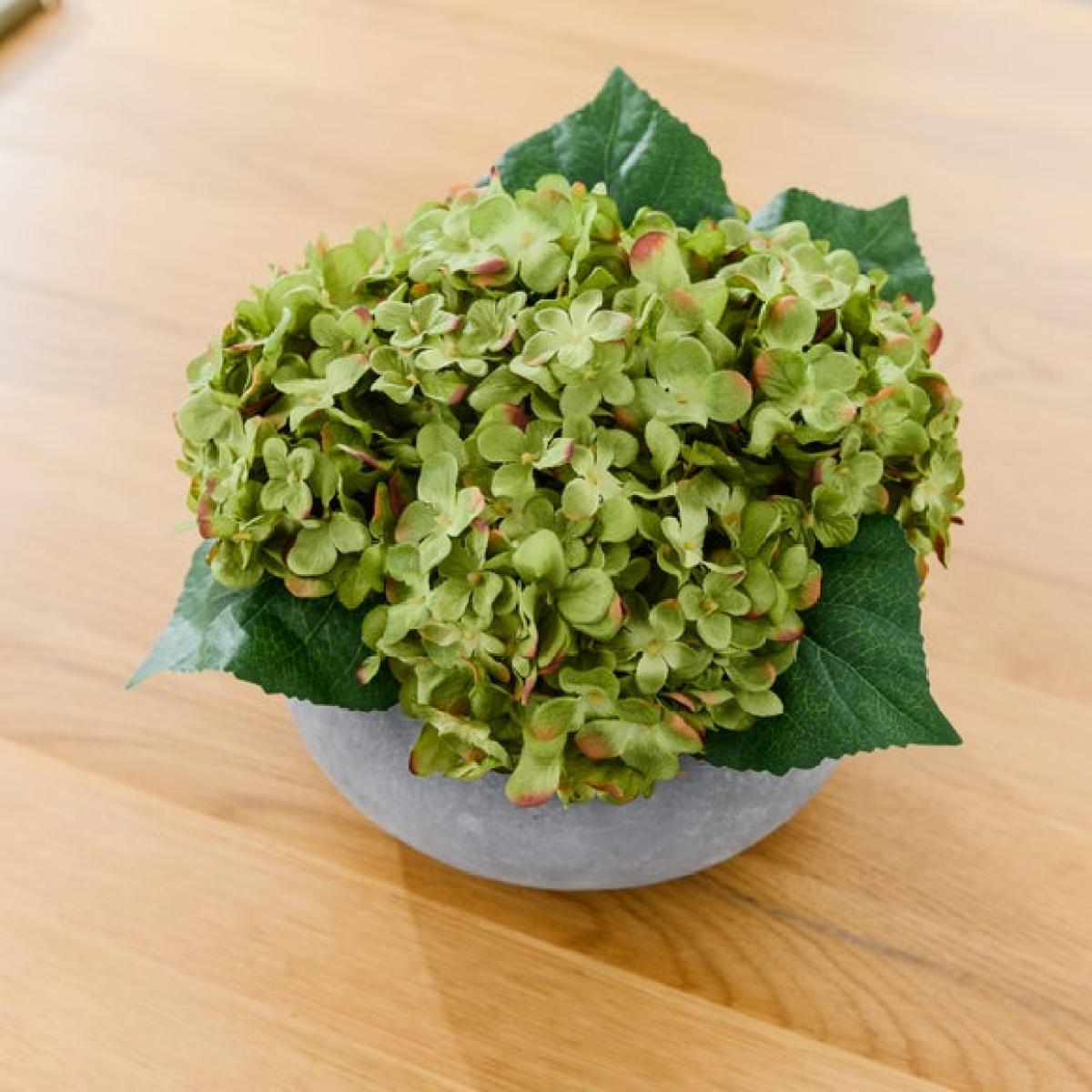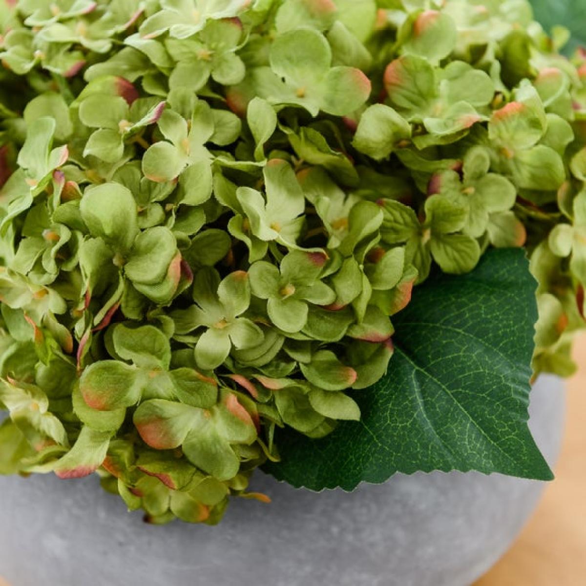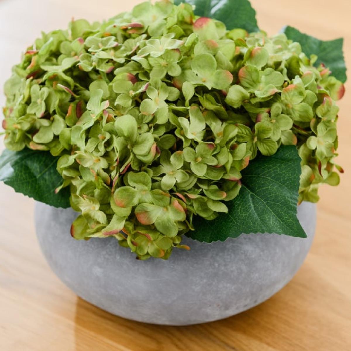 * Realistic green hydrangea * Low, wide arrangement * Grey cement look plant pot * Ideal for coffee tables or sideboards Want to brighten up your coffee table or sideboard? This artificial green hydrangea arrangement could do the trick. The realistic hydrangea blooms are in a lovely shade of green, and sit in a low and wide arrangement, perfect for those spots. The arrangement is presented in a smart grey cement-look pot that will blend beautifully with a range of decor styles. Best of all, it needs no maintenance. Simply set it down and enjoy a bit of lasting colour.
