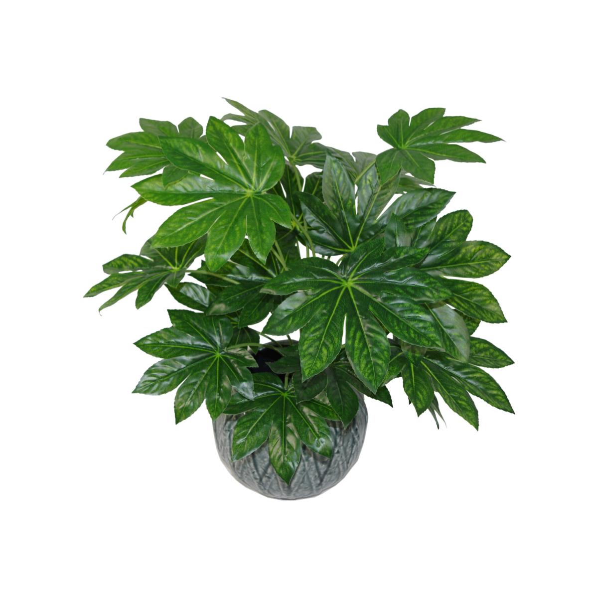 Our artificial version of Japanese Aralia (also known as Fatsia Japonica and False Castor Oil Plant) brightens up any room. Its classic shape- vibrant green colouring and interesting leaf style make it an ideal artificial houseplant. It is an exotic tropical-looking plant which is native to Japan and Korea. The name Fatsia Japonica comes from the old Japanese word for eight ("fatsi" in old Japanese) referring to the eight lobes of the leaves. The width will vary depending on how you arrange the leaves. The stems are wired and can be rearranged to suit your requirements. It comes potted in a plain black plastic pot and is ready to display (any photos with ceramic planters are for illustration only) - just arrange the stems as you wish.