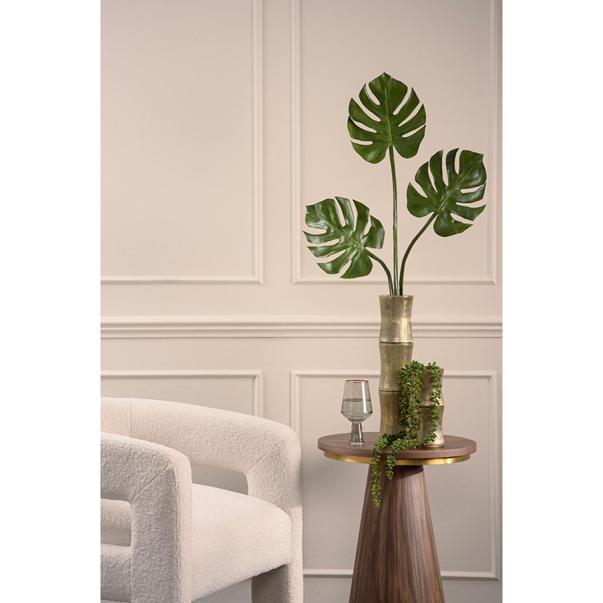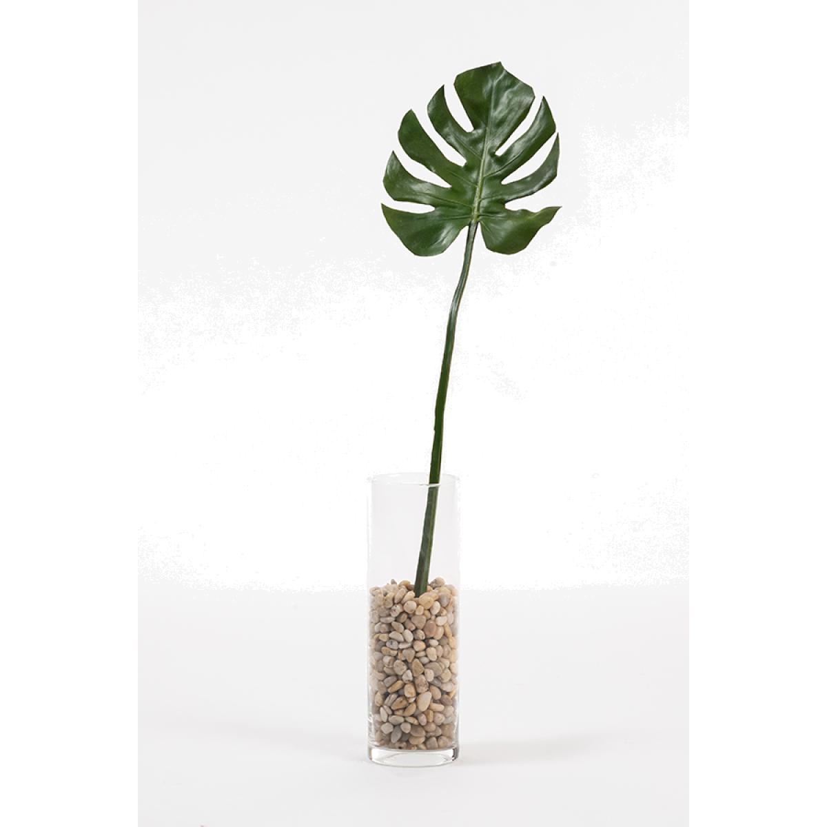 A striking large-scale artificial Cheese Plant leaf. Realistic-looking high-quality reproduction. Use individually or in a group to create a large impressive arrangement. Vase and pebbles are for display purposes only and are not included.