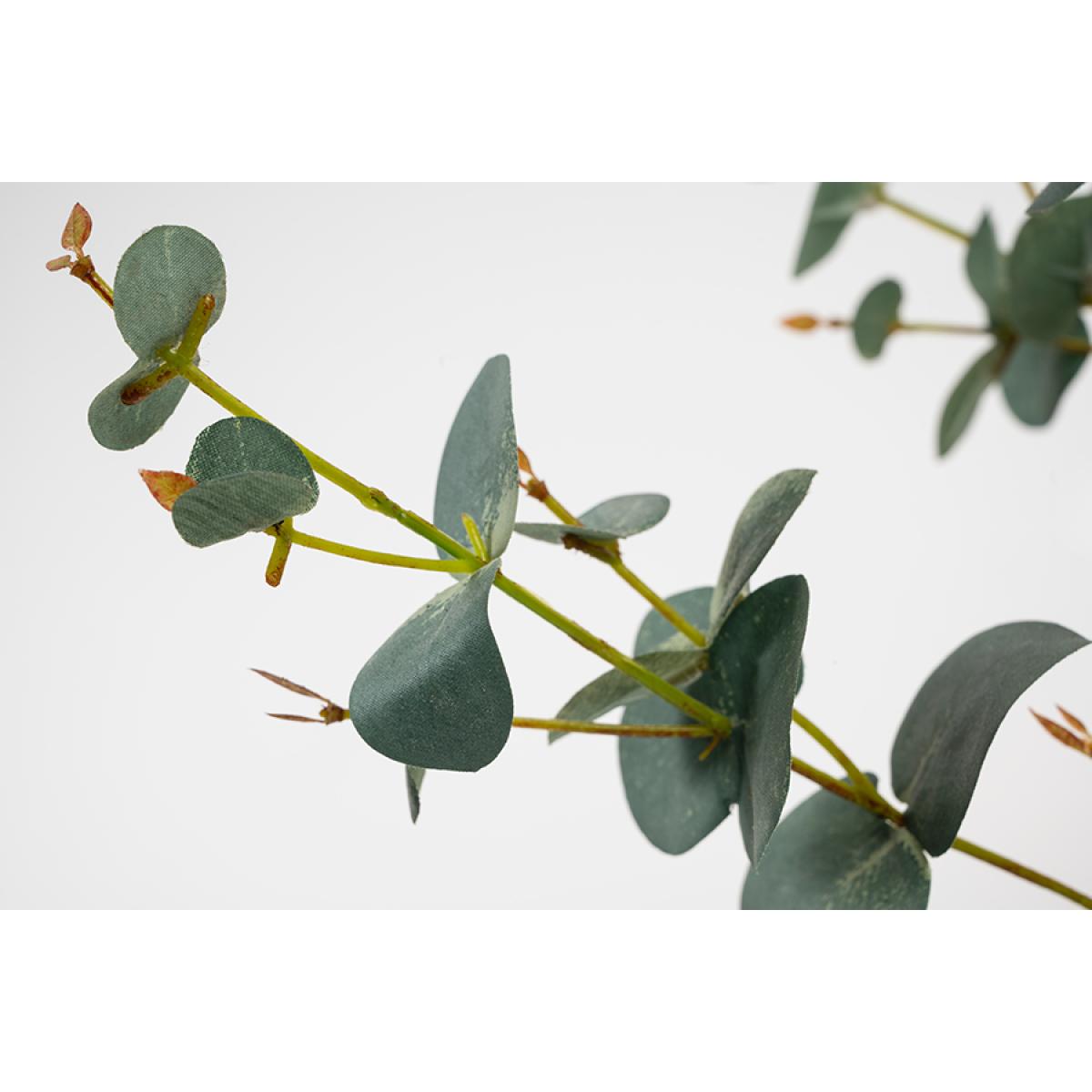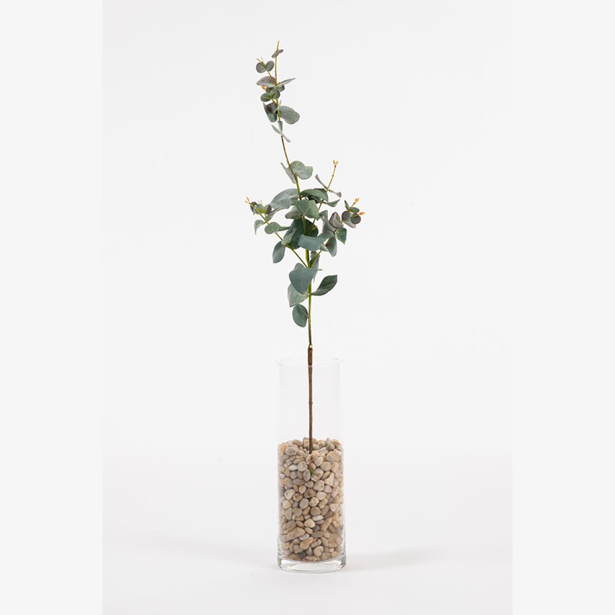 A pretty large-scale artificial Eucalyptus Stem. Realistic-looking high-quality reproduction. Use individually or in a group to create a large impressive arrangement. Vase and pebbles are for display purposes only and are not included.