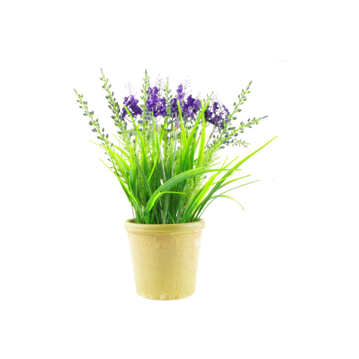 Artificial Lavender Grass Plant with Stoneware Planter. Part of our range of realistic plants and floral arrangements this lavender plant looks great on a desk or window sill. It is fixed into the supplied planter and is ready to display. Stems of the lavender are wired and can be shaped to your requirements. It comes potted in a stoneware planter and is ready to display. Recommended for indoor only use due to delicate flowers.