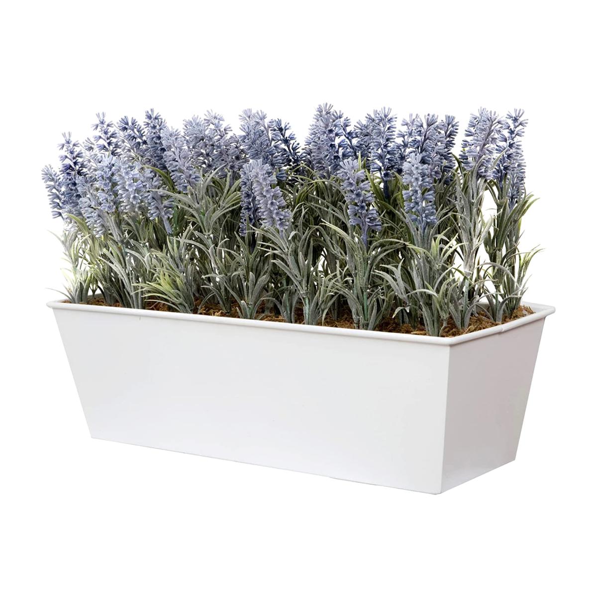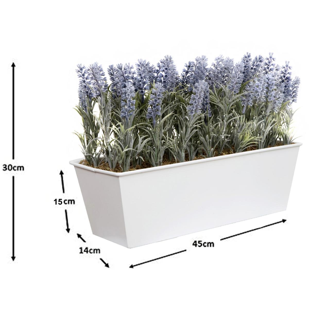 This stunning purple Lavender window box, in a stylish White tin freestanding window box is a stunning addition to your home, garden, office or business to add a beautiful natural theme. Extremely lifelike and realistic looking, from a short distance it's hard to believe it is not real. Perfect if you don't want the hassle or have the time to care for living plants. They are maintenance free, the attractive greenery and flowers will be a nice touch for your window sill, conservatory, porch, patio or entranceway. They also look absolutely fantastic on the balcony, also outside shop fronts, offices and receptions along with bars & restaurants. Please note the plants are packed in cardboard cartons for maximum protection. The perfect shape can be regained by gently pulling and fluffing the foliage back into shape.