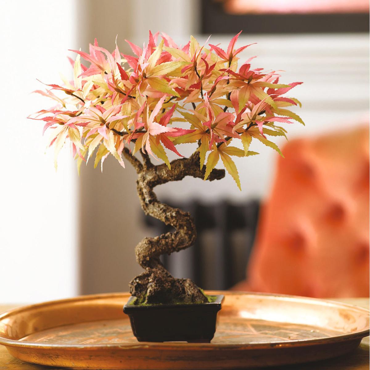 This delightful Maple Bonsai symbolises peace, harmony, and all that is good in nature. The art of miniature tree growing was derived from thousand-year-old Chinese horticultural practises, adapted by the Japanese some 700-years ago, and given the name bon-sai, meaning planted in a container. Caring for a bonsai is a well-respected skill amongst gardeners, yet our little miracle asks for nothing but to be admired. Caught at the peak of its autumnal glow, it brings calm and balance when placed on a side table in your home, or beside your computer on a desk.