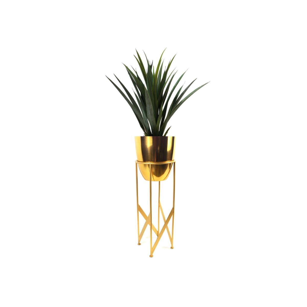 Metal planter and stand with artificial yukka plant included. Can be used together or separately. A luxurious piece from our collection of lifelike plants and trees. Ideal for creating an instant statmeent with no maintenance. Metal planter and stand with artificial yukka plant included. Can be used to gether or separately.