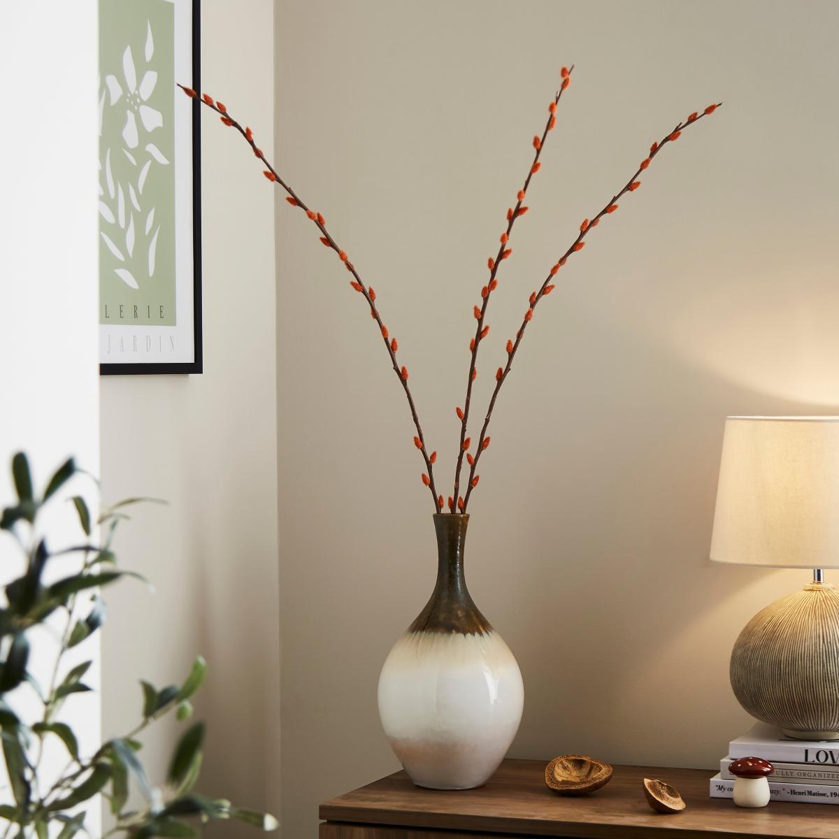 I love how the orange pussy willow stem adds a pop of colour and texture to both modern and rustic interiors. It works particularly well in eclectic or contemporary schemes, where it can serve as a statement piece in a vase or used to enhance other dried or artificial arrangements. Practical styling tips include placing it in a tall, slim vase to emphasise its vertical form, or grouping a few stems together for a fuller display. Because it’s artificial, it’s low-maintenance and perfect for spaces with limited natural light or busy households, providing year-round visual interest without the worry of wilting or fading.