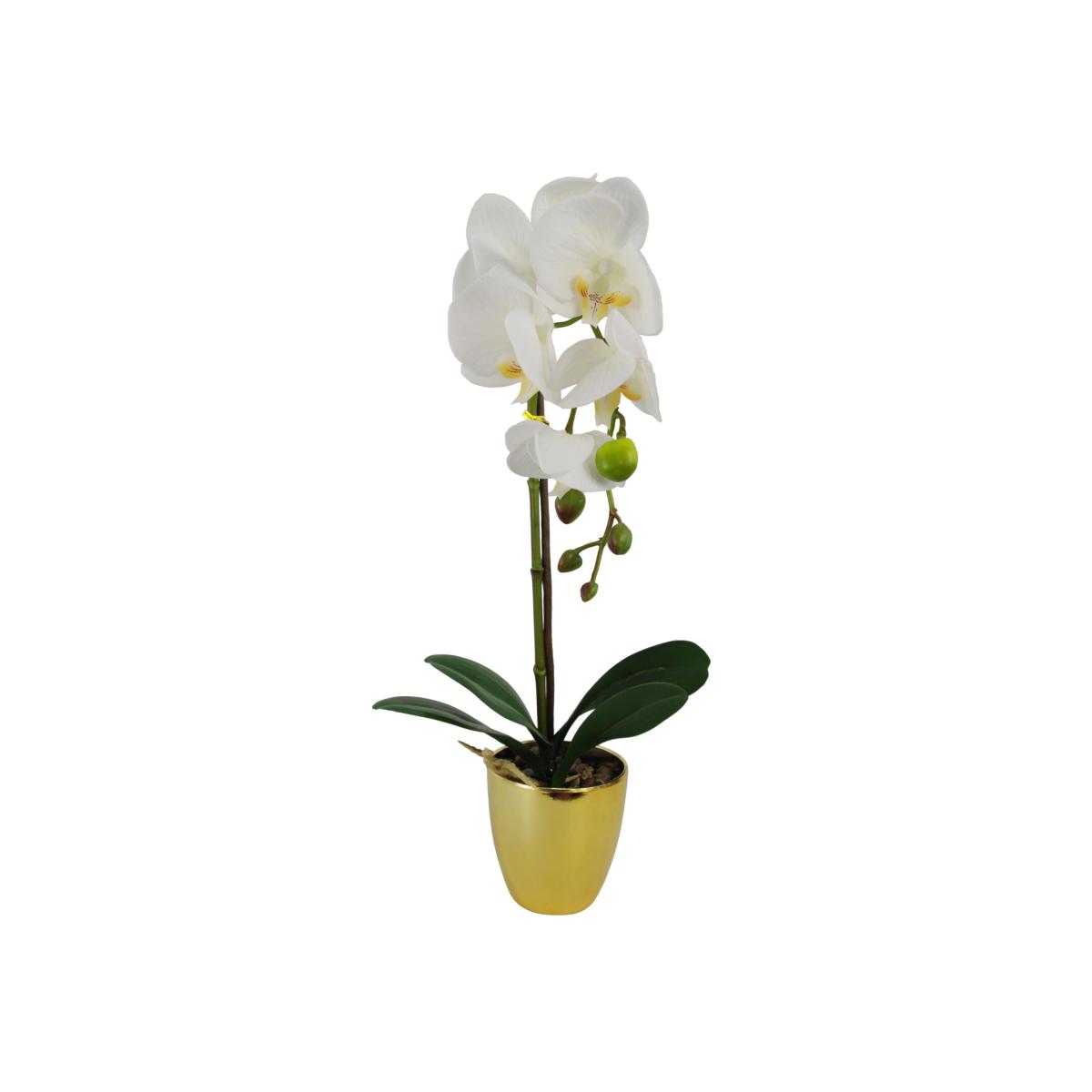 Realistic artificial orchid plant with real touch leaves, glued fixed gravel base, potted in a plastic decorative pot as shown. 6 real touch flowers. Pot is plastic and measures 9cm (h) x 9cm (w). Stems are wired and this plant can be arranged to your requirements.