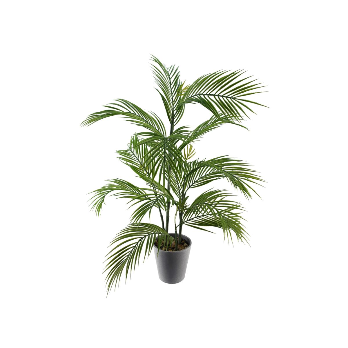 A gorgeous artificial palm in a decorative plastic planter, ready to display staight out of the box. 14 large leaves and four small leaves. The stems are wired and the leaves can be shaped to fit your space. The decorative grey plastic planter measures 15cm (h) x 15cm (w). The leaves are plastic. The decorative planter is topped with fixed pebbles for an attractive, low maintenance finish.