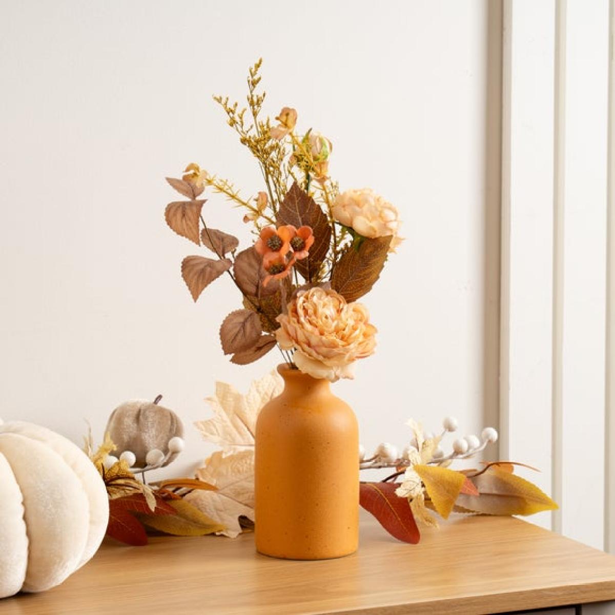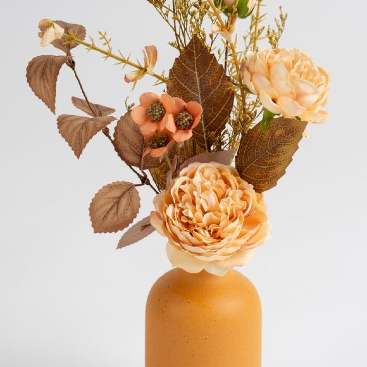 I love this faux peach rose arrangement in the yellow vase for its subtle colour palette and versatile aesthetic. It instantly adds warmth and visual interest to both contemporary and vintage-inspired interiors. It works particularly well in neutral, minimalist spaces where it can serve as a gentle pop of colour, or within cosy, rustic settings to complement natural wood tones. For styling tips, try grouping it with other textured objects like candles or ceramics on a sideboard, or use it as a centrepiece on a dining table or console. Its artificial construction means it’s low maintenance and perfect for enhancing a space without the fuss of fresh flowers.