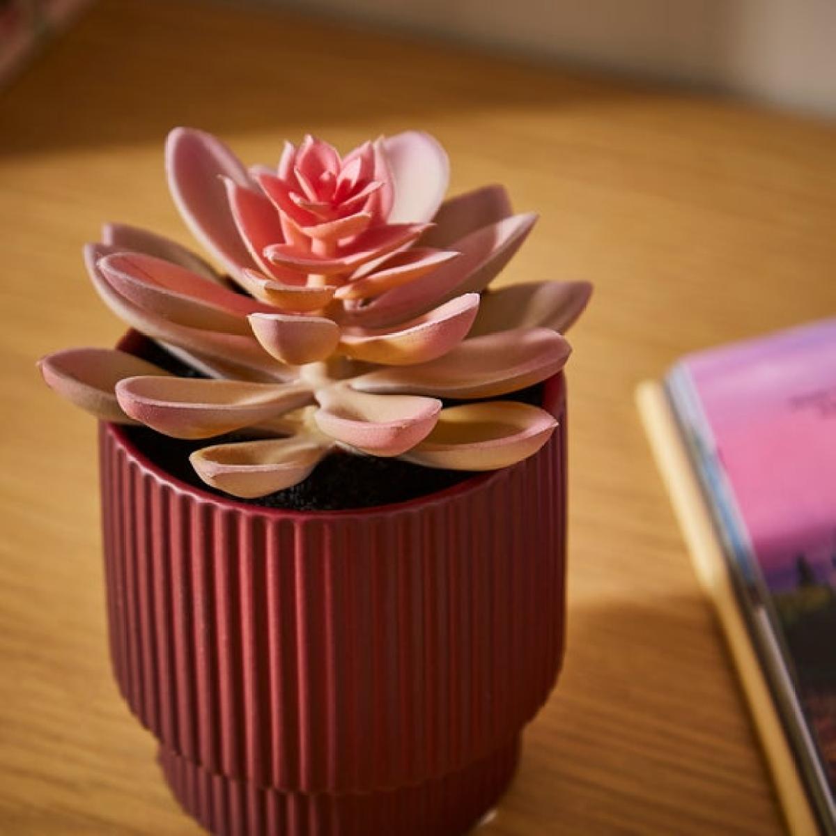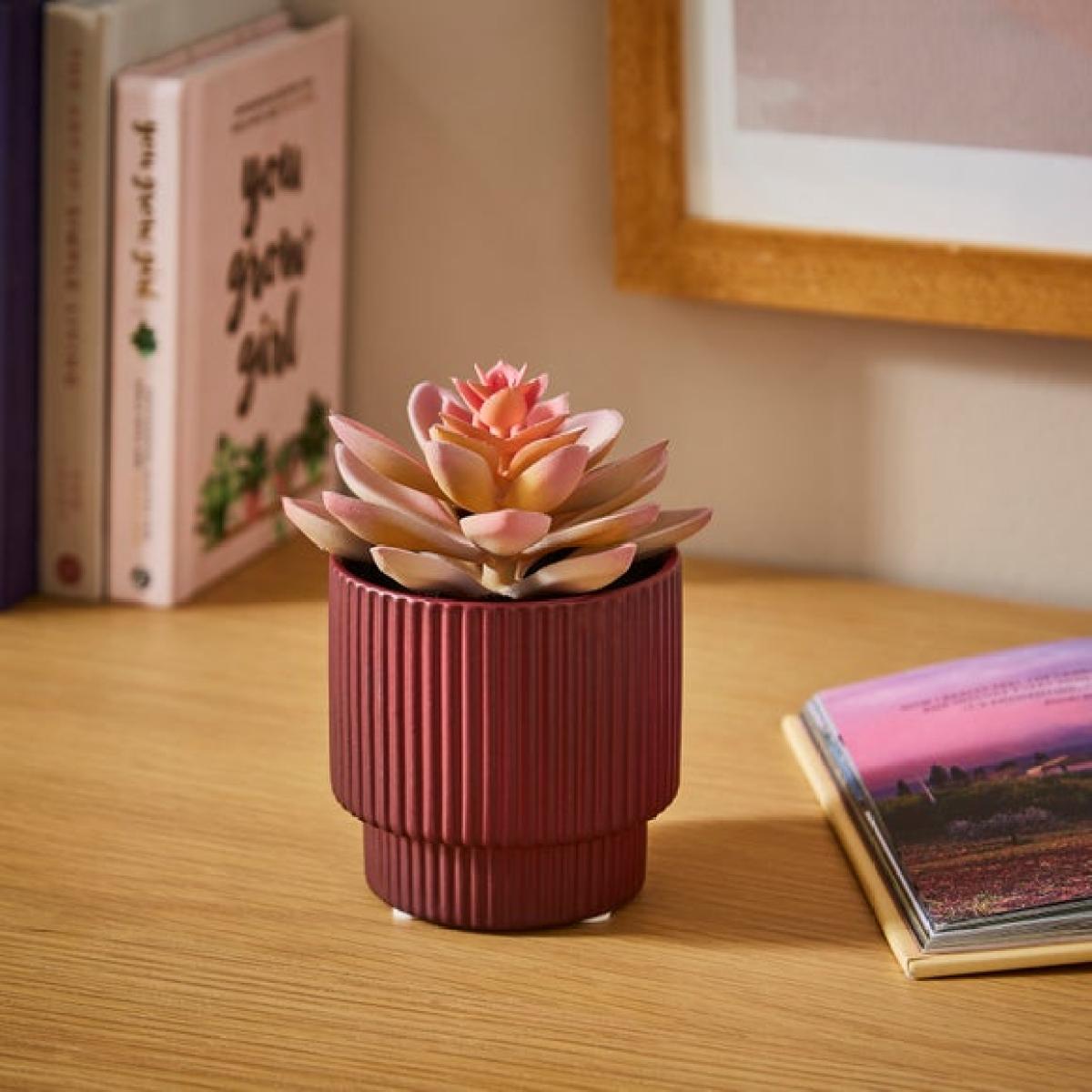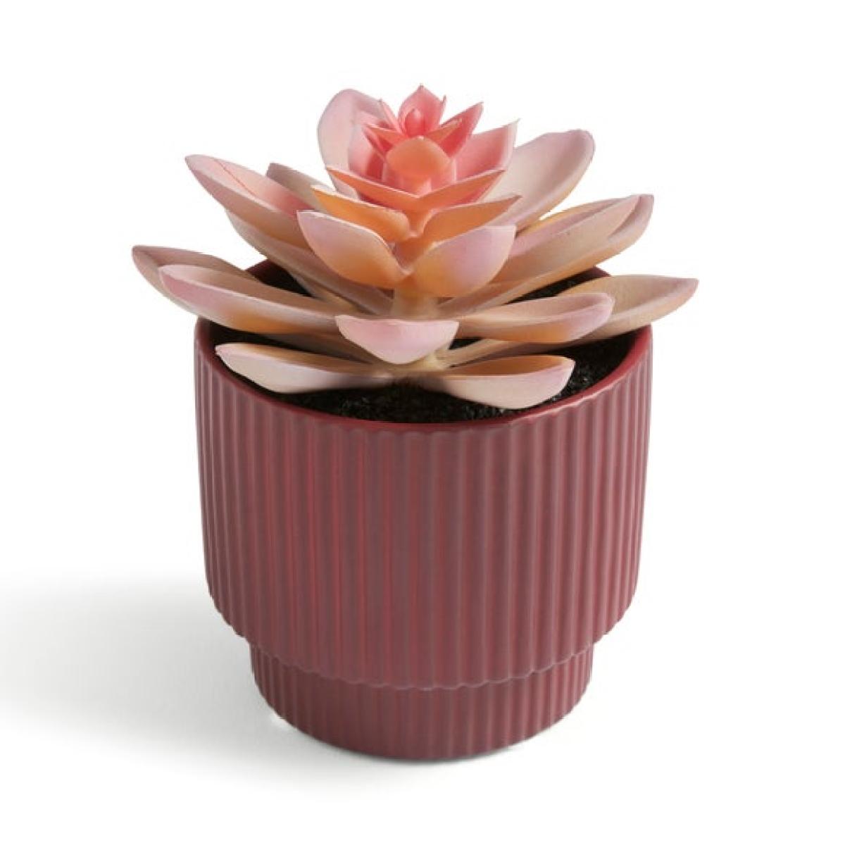 * Soft pink artificial plant * Burgundy ribbed ceramic pot * No watering needed * Instant colour Add a pop of colour to your living space with this soft pink artificial succulent, nestled in a rich burgundy ribbed pot. Realistic and low maintenance, it's a vibrant way to bring nature indoors, with no watering required. Perfect for brightening up shelves, windowsills or desks, and a fuss-free touch of freshness for any room.
