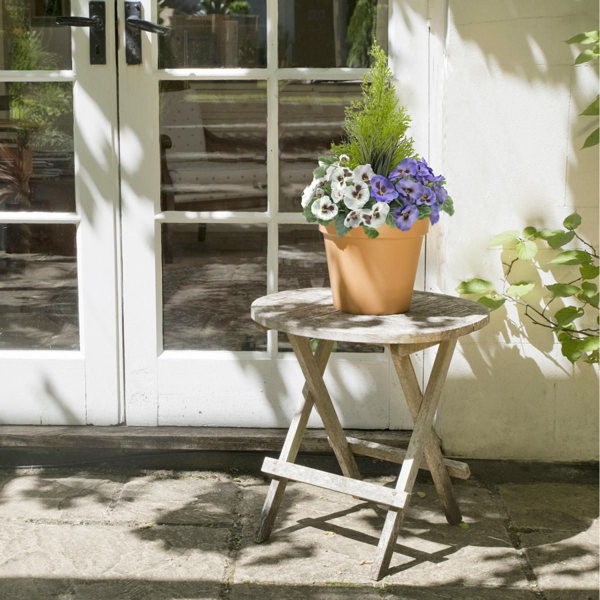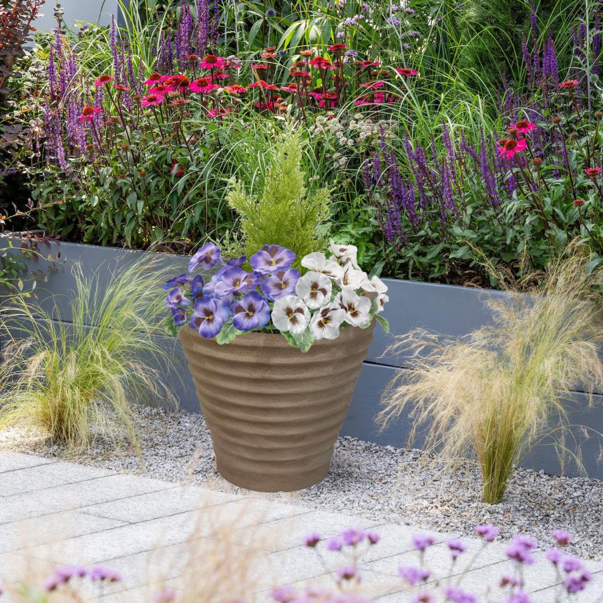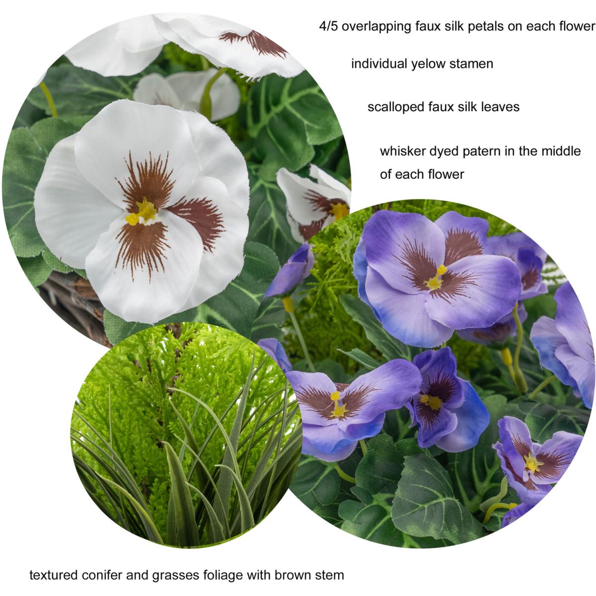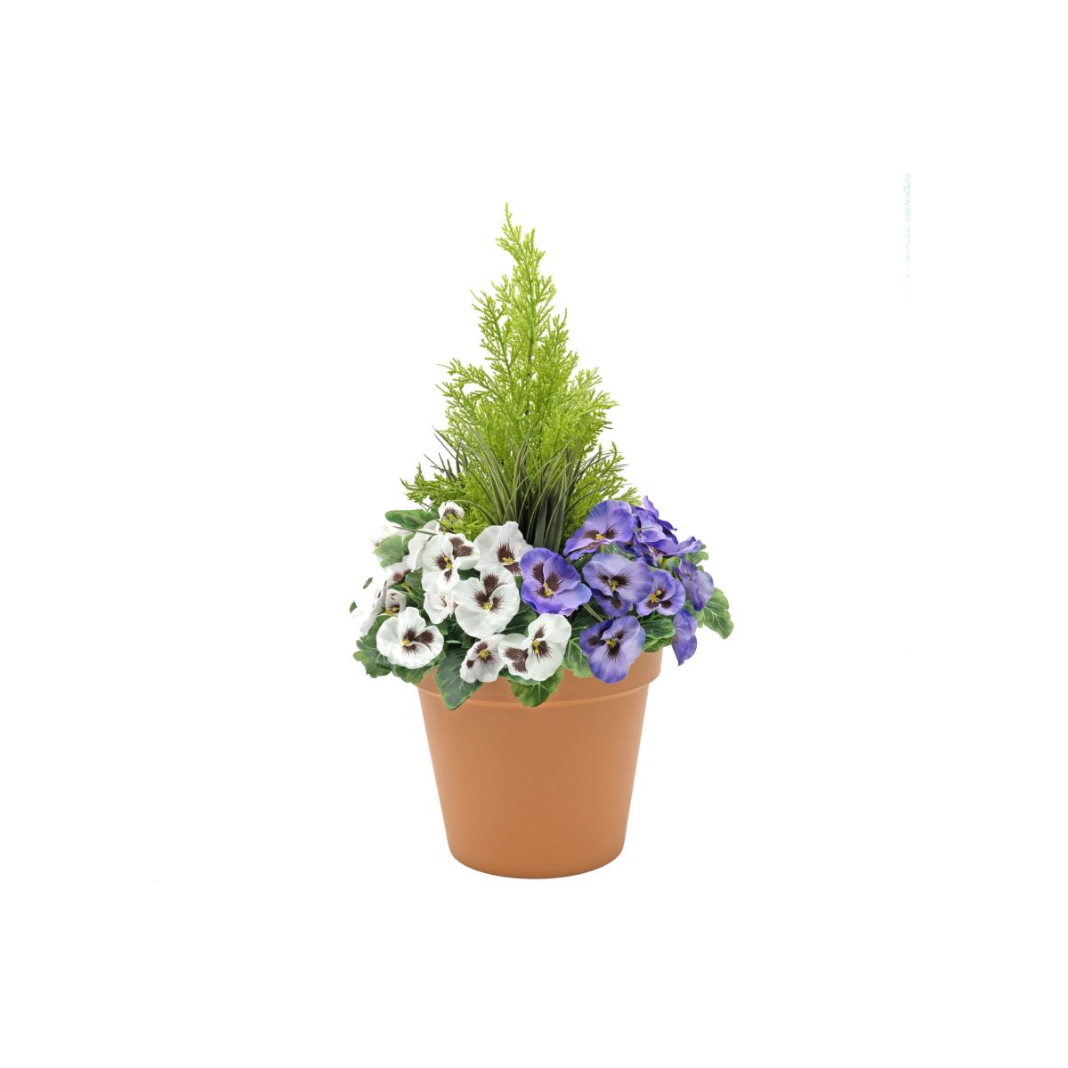 Plastic patio planters with bright and vibrant artificial pansies and decorative conifer cedar topiary in the centre. Extremely realistic and life-like looking. Pot size width 24cm, height 21cm. The overall height including the plants is approximately 60cm. Ready assembled and ready to display straightaway on your porch, patio, or garden. Suitable for both indoor and outdoor use (UV protected to prevent colour fading). They look fantastic anywhere in the garden or around the house but are also great outside shop fronts, bars, restaurants, hotels, offices, schools, and nurseries. The planters are packed in cardboard boxes for protection during shipment, this may cause the foliage to be a little compressed or out of shape on arrival. We recommend you spend a little time when you open the box to gently arrange the foliage by folding branches, leaves and flowers to a natural-looking shape.