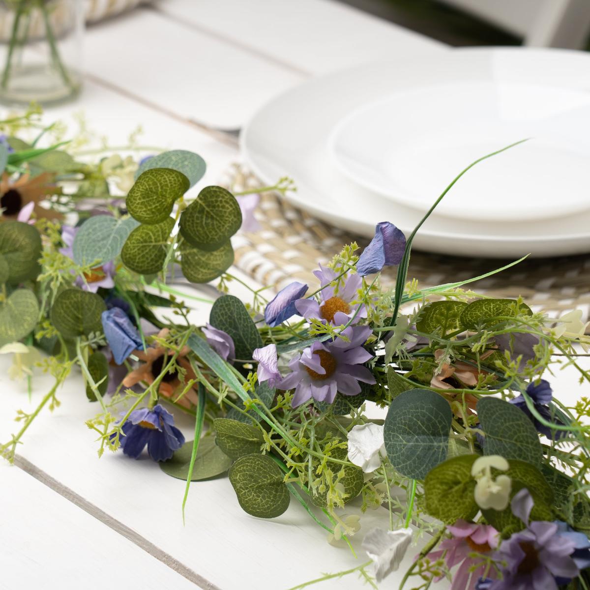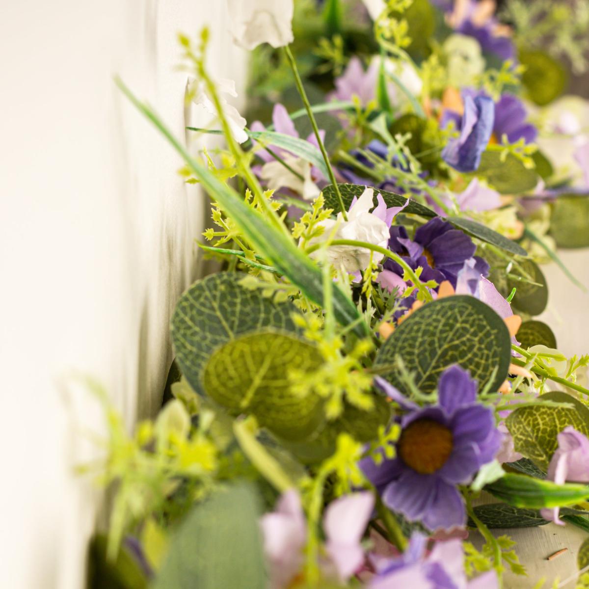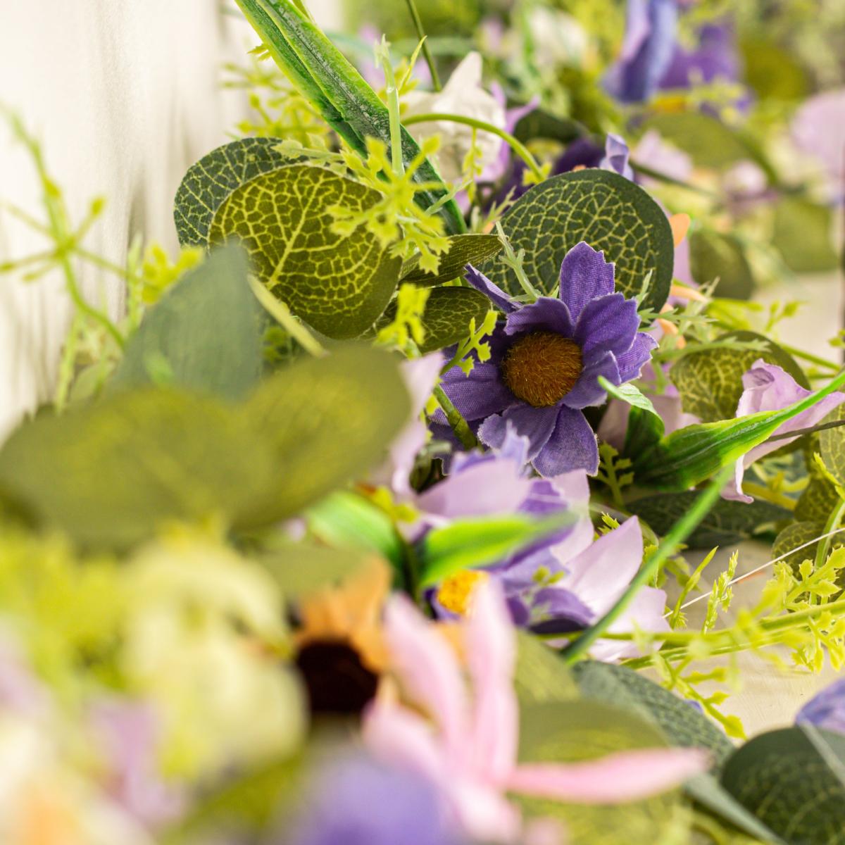 * Features daisies, lavender, and eucalyptus* Length: 150cm* Recommended for indoor use* Perfect for use as wedding decorations The Artificial Purple Spring Florals Garland adds a touch of seasonal charm to any space. With daisies and lavender nestled among green foliage, this delicate garland is perfect for Spring tablescapes, bedroom décor, or weddings.
