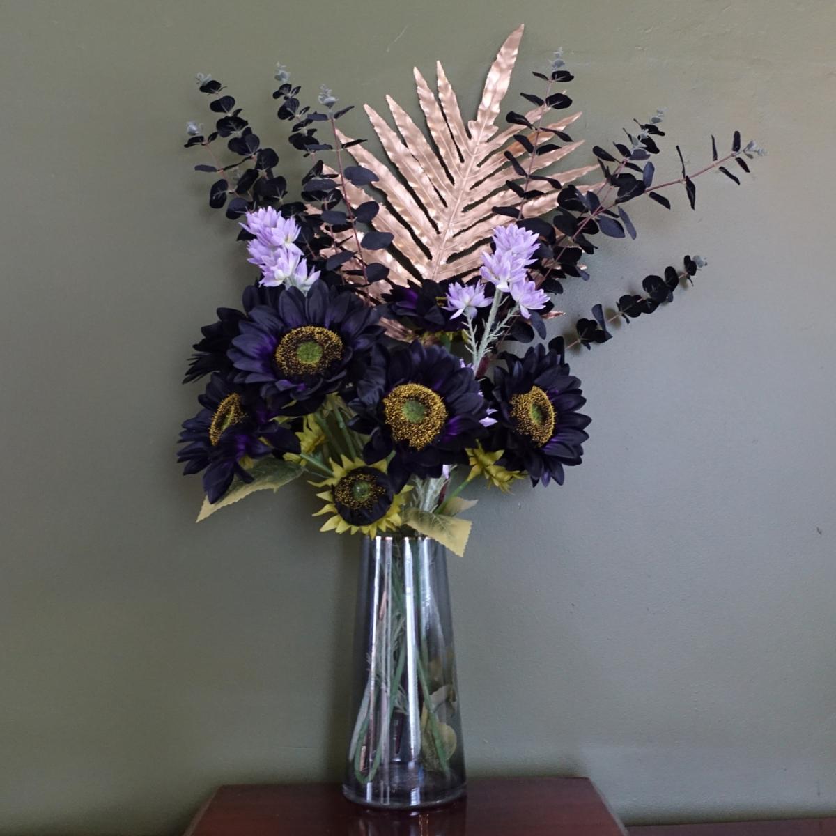 These artificial flower arrangements come with the vases a complete pack of everything you need to create the display shown in our photos. Sizes given in item specifics are the overall measurements when arranged as shown in our pictures. Sizes of individual stems vary and are given in the following description. Stems are wired and this can be shaped to your requirements. This pack contains the following 1 x LEAF-40578 28cm gold rim smoke grey glass vase 28cm tall x 13.5cm x 13.5cm at widest points and the slightly narrower top rim measures 9.5cm diameter. 1 x LEAF-40658 95cm gold palm leaf 95cm overall x 35cm wide. 3 x LEAF-40662 88cm purple artificial sunflower with three flowers. 2 x LEAF-40676 60cm purple starflower stem with five silk flowers. 2 x LEAF-40695 80cm black eucalyptus foliage stem. Flowers and foliage are supplied loose at full length ready for you arrange. You can cut these shorter if wanted for arrangement (very easy- just use wire cutters) or you can just fold the stems at the ends before putting them in the vase
