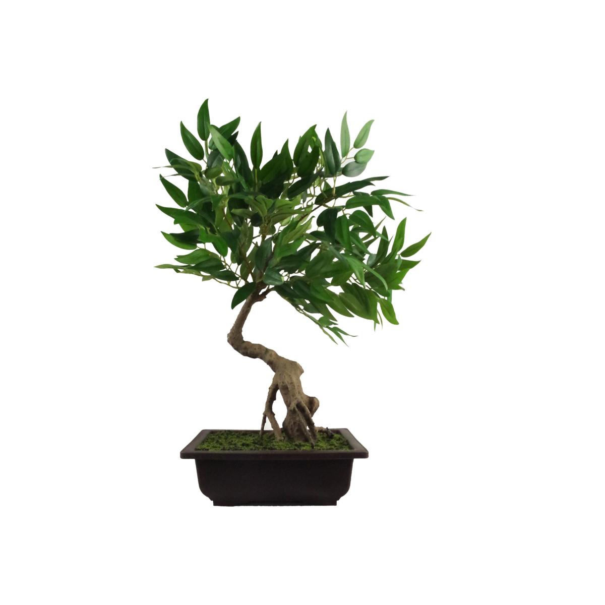 This artificial bonsai tree, comes fully potted in a decorative plastic planter- ready to display. Everything from the detail on the trunk to the moss effect base has been beautifully crafted. This plant has all the attractiveness of a bonsai without any of the maintenance. The main trunk is fixed but the larger brown stem offshoots are wired so there is an element of flexibility to this tree and the main branches can be shaped and arranged to fit your space. Pot material Plastic. Leaves Silk. Trunk Moulded plastic. Not suitable for outdoor use. Pot Measurements 22.5 (w) x 8 (h). Overall Size 50x40x30cm