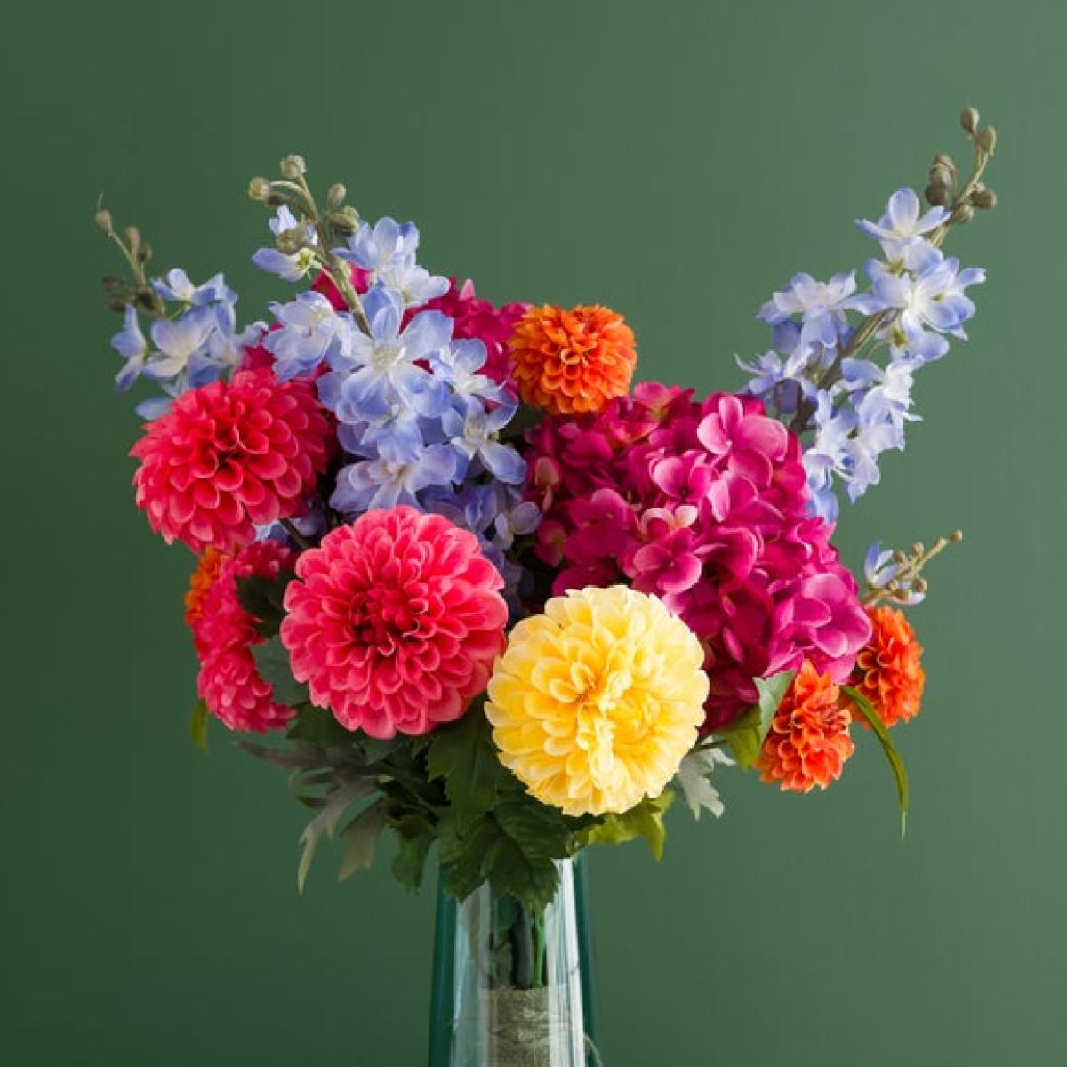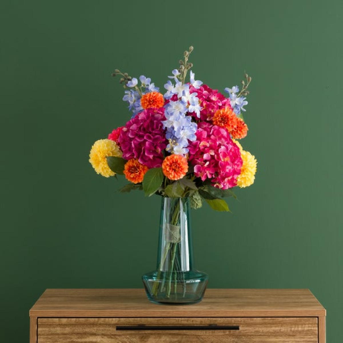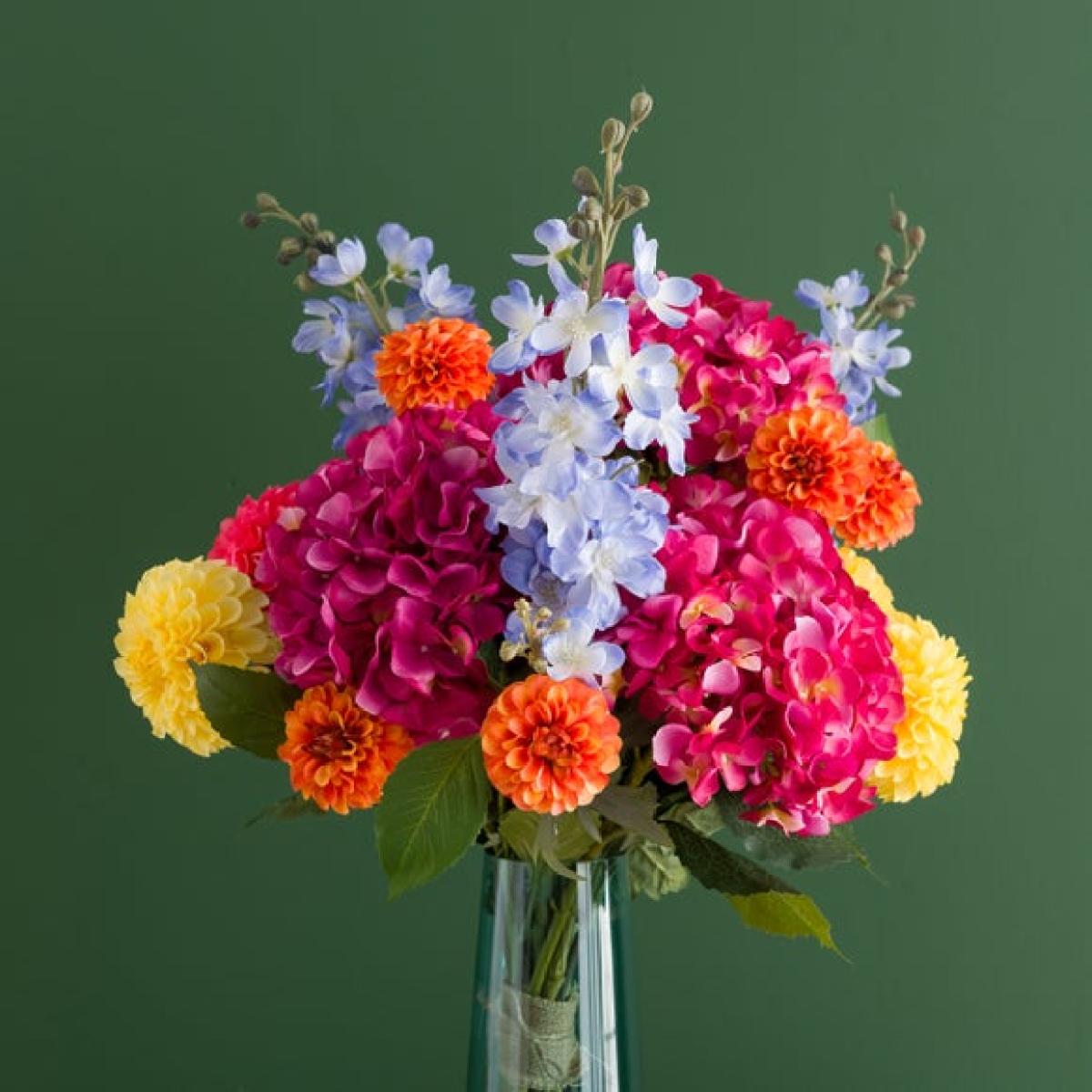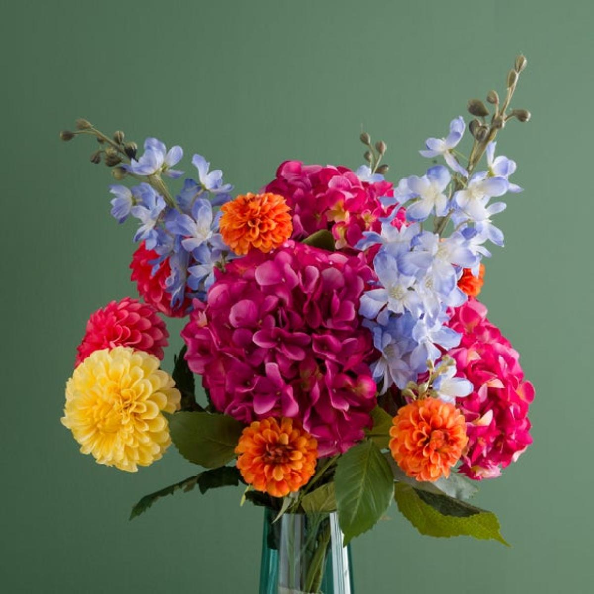 * Hydrangeas, delphinium & ball dahlias * Bold, colourful mix * Realistic, long‑lasting blooms * Pre‑arranged and ready to display * No watering required Add instant vibrancy to your home with this eye-catching bouquet, featuring plush hydrangeas, elegant delphinium and rounded dahlias in a lively colour palette. Pre‑arranged for effortless styling, it slips straight into your favourite vase (not included) for a quick pop of colour. Lifelike petals and layered foliage keep their fresh look day after day. A simple way to brighten living rooms, hallways or dining spaces all year round.