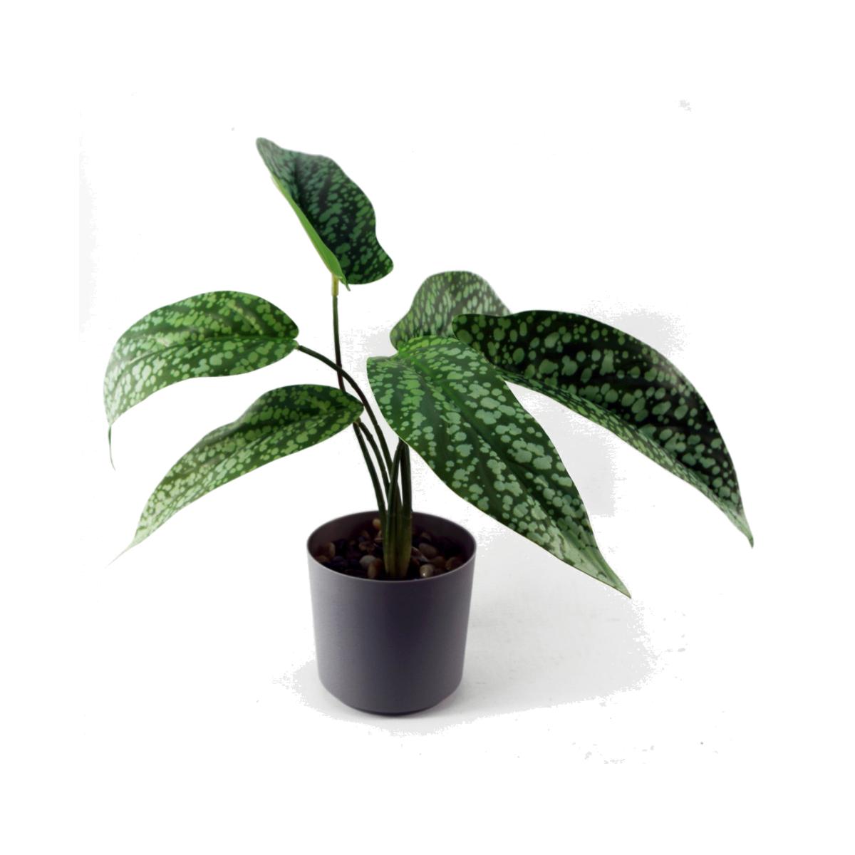 Spotted plant with printed plastic leaves in a decorative plastic planter. Large format leaves. The stems are wired and the leaves can be shaped to fit your space. The decorative grey plastic planter measures 10cm (h) x 10cm (w). The leaves are plastic. The plastic decorative planter is topped with fixed pebbles for an attractive, low maintenance finish.