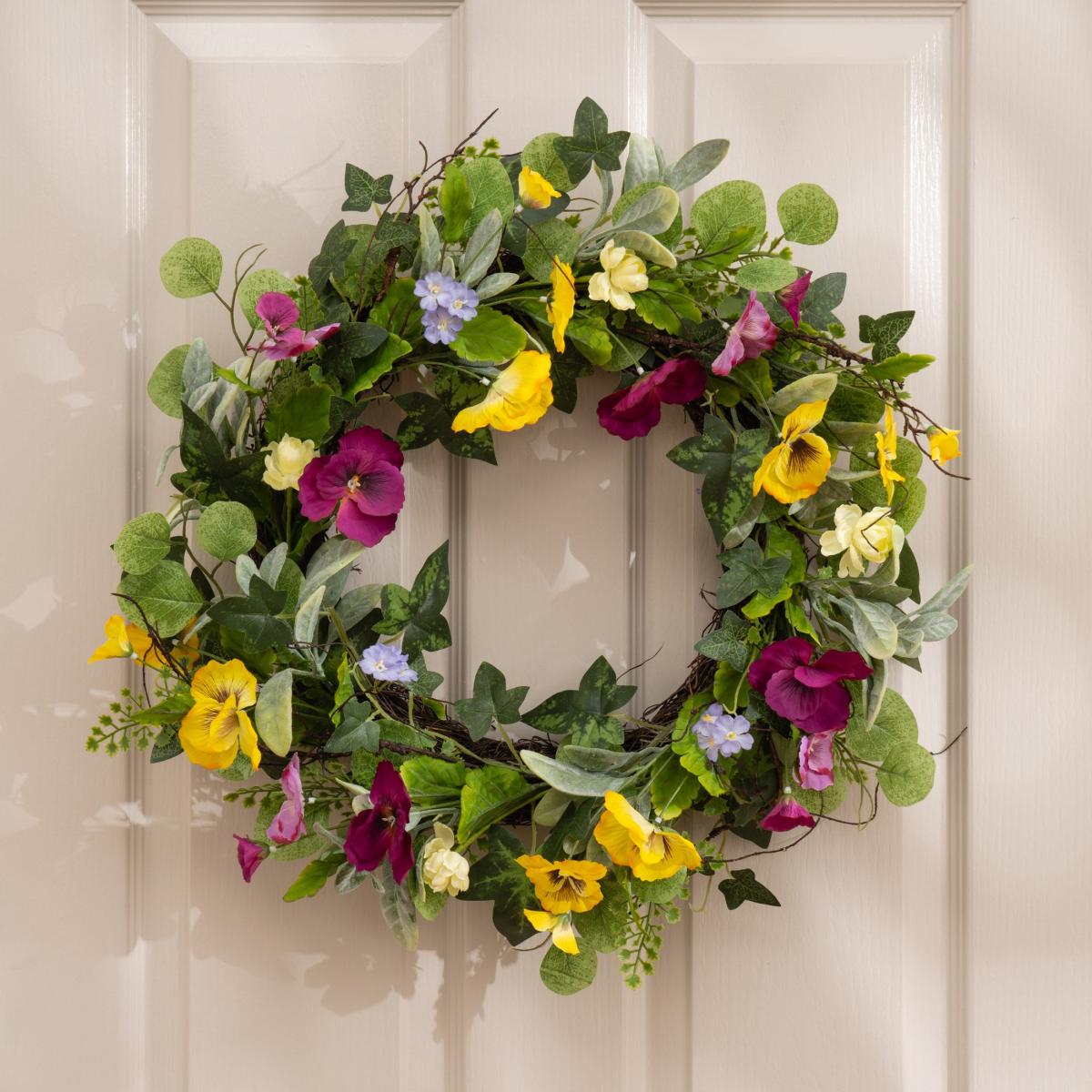 * Artificial pansy wreath * Bright Spring colour * 55cm diameter This vibrant artificial pansy wreath brings the colours of spring right to your door. Perfect for adding a burst of seasonal charm, it’s ideal for hanging on your front door, walls, or in a window. Its cheerful design will brighten up any space, making it a lovely touch for springtime gatherings or Easter celebrations. For long-lasting freshness, bring it indoors during adverse weather conditions.
