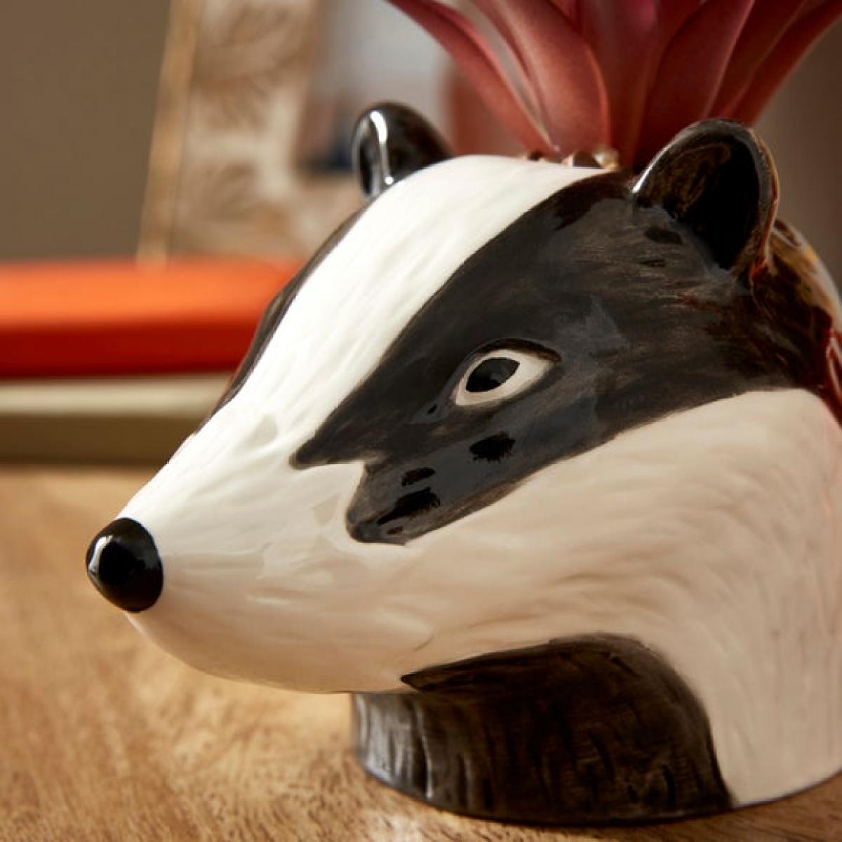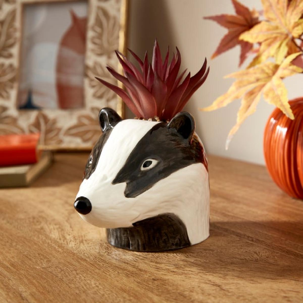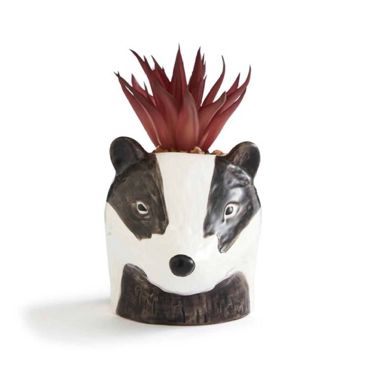 * Artificial succulent * Ceramic badger plant pot * Great for countryside style Bring woodland style to your home with this playful ceramic badger plant pot, complete with a vibrant red artificial succulent. Featuring a beautifully detailed badger head design, it’s an eye-catching accent with zero maintenance required. Perfect for adding a cheerful pop of colour to shelves, desks, or windowsills, it's ideal for year round interest.
