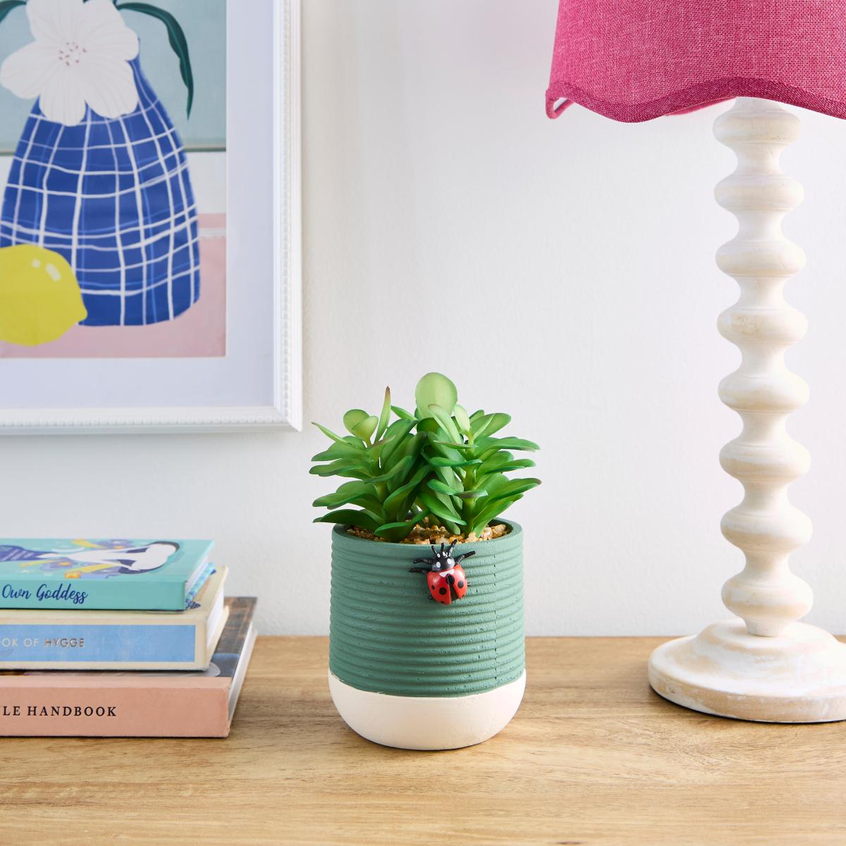 * Ceramic pot * Life like * Embossed design Add a pop of greenery with this adorable faux succulent, complete with a delightful ladybird detail. Perfect for brightening up small spaces, this lifelike plant brings a natural feel without the need for watering.