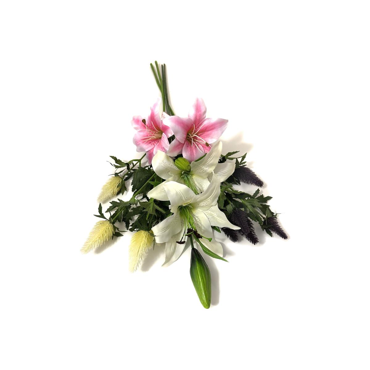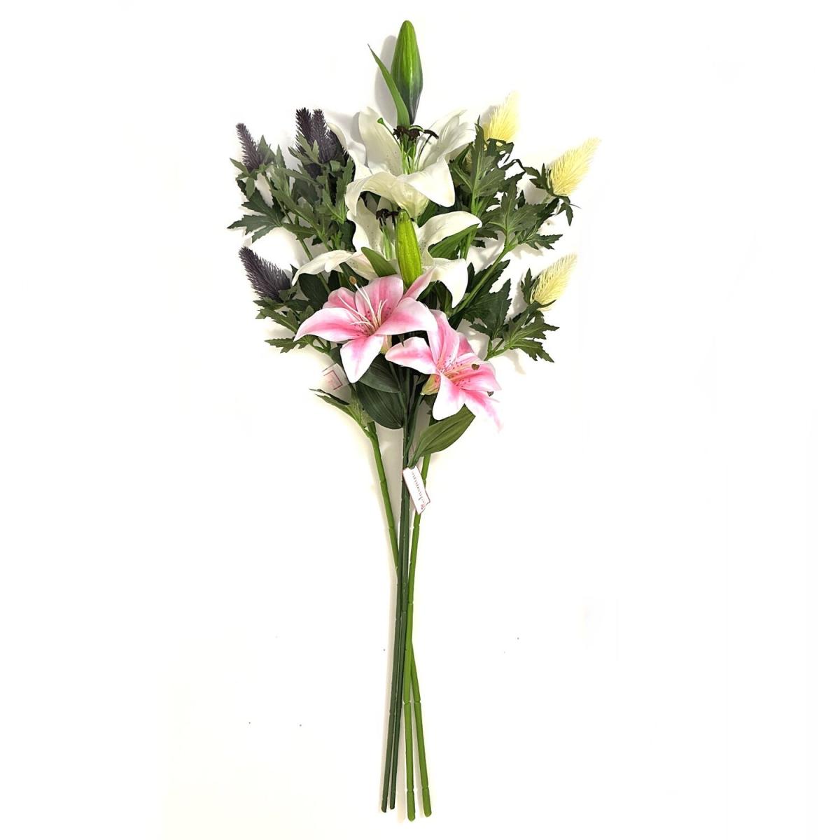 This lovely Artificial flower arrangement includes 2 Sea Holly stems and 2 Tiger Lily stems (Pink) and (Ivory) with Ivory and Pink flowers. Perfect for faux flower craft projects, wedding decorations, gifts and flower displays in lobby areas, hallways, living rooms and entertaining areas. Made from high quality materials this display should look great for years.