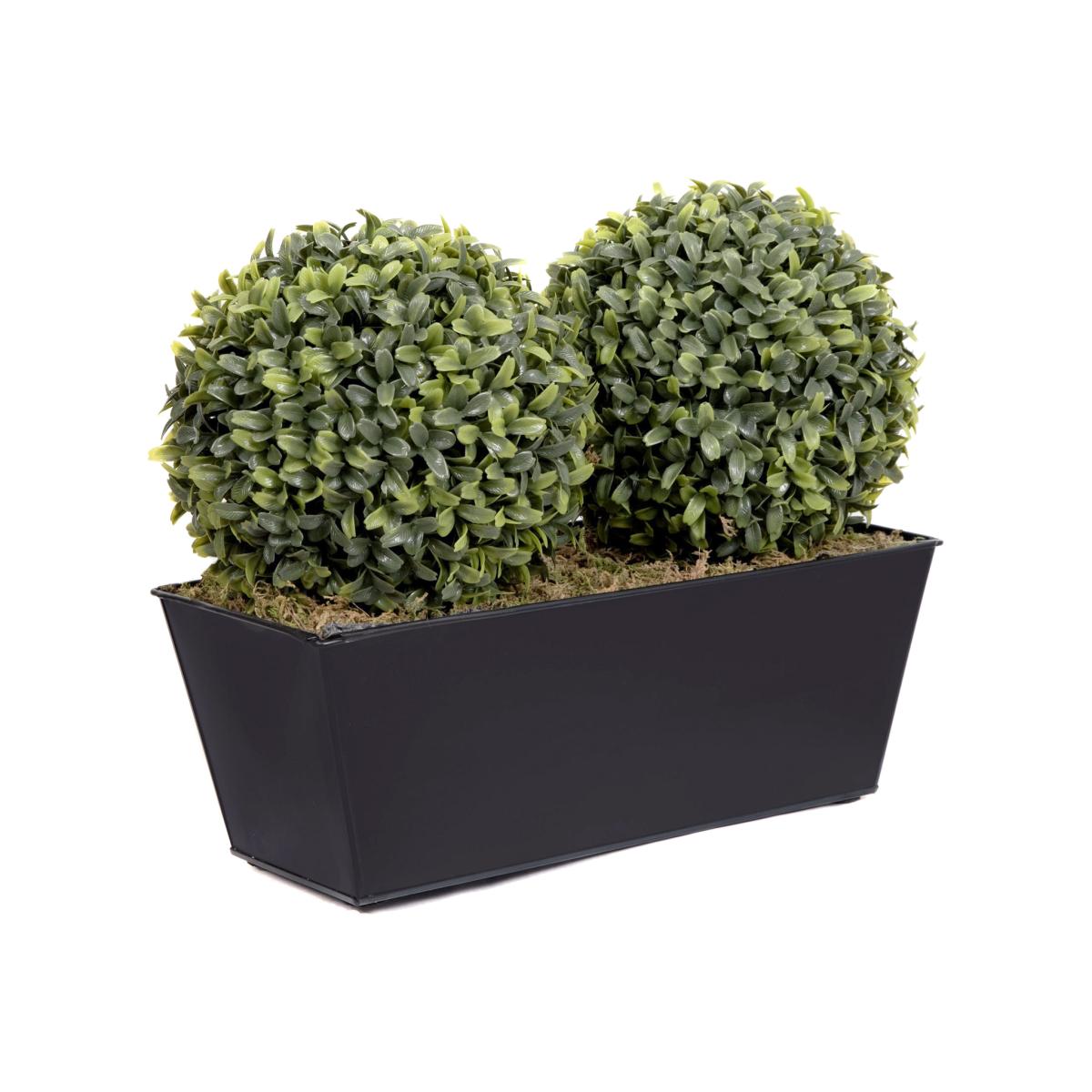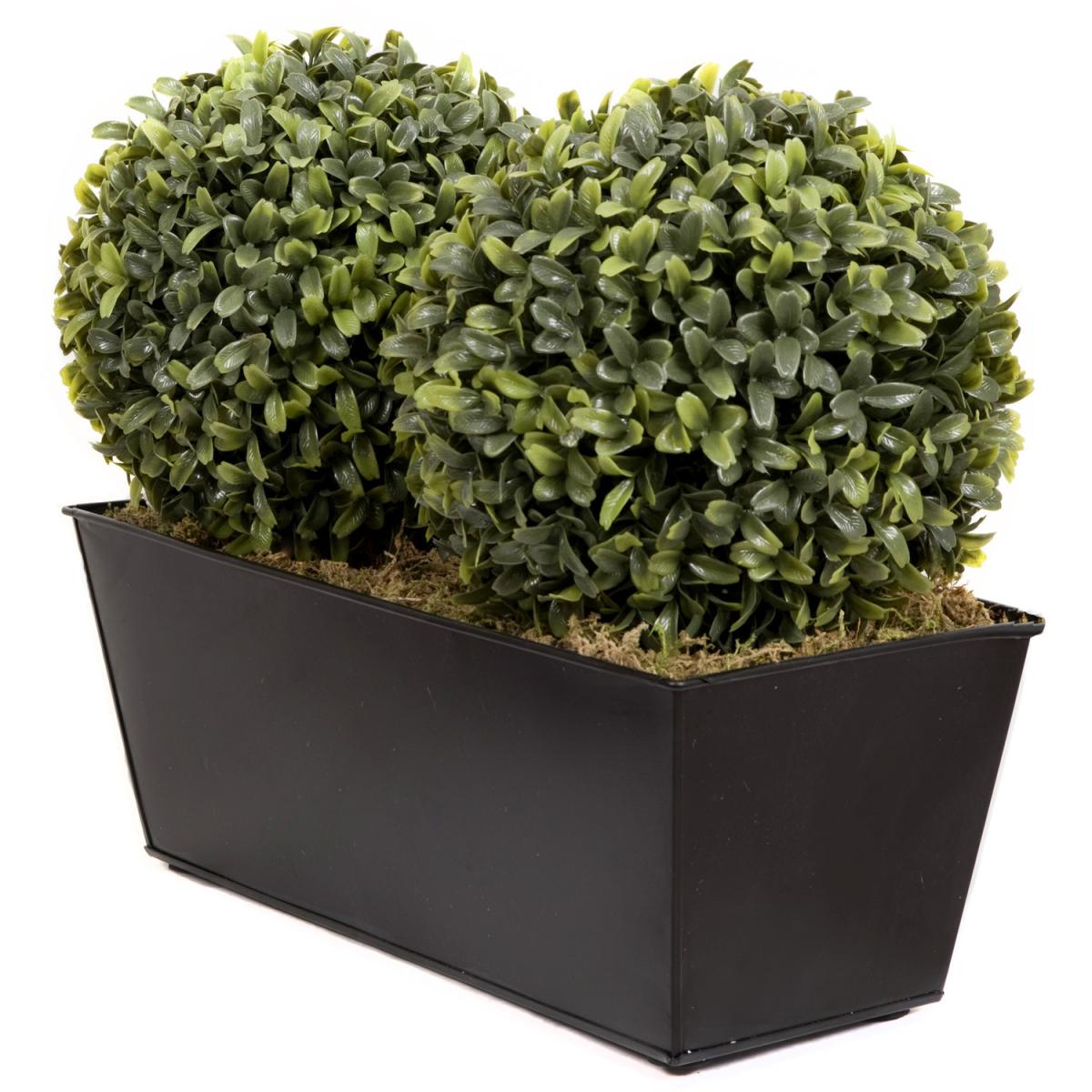 This elegant double Boxwood ball window box in a stylish Black freestanding tin planter is a stunning addition to your home, garden, office or business to add a beautiful natural theme. Extremely lifelike and realistic looking, from a short distance it's hard to believe it is not real. Perfect if you don't want the hassle or have the time to care for living plants. They are maintenance free, no need for water, soil, sun or trimming the attractive greenery and flowers will be a nice touch for your window sill, conservatory, porch, patio or entranceway. They also look absolutely fantastic on the balcony, also outside shop fronts, offices and receptions along with bars & restaurants. Please note the plants are packed in cardboard cartons for maximum protection. The plants are ready assembled. The perfect shape can be regained by gently pulling and fluffing the foliage back into shape.