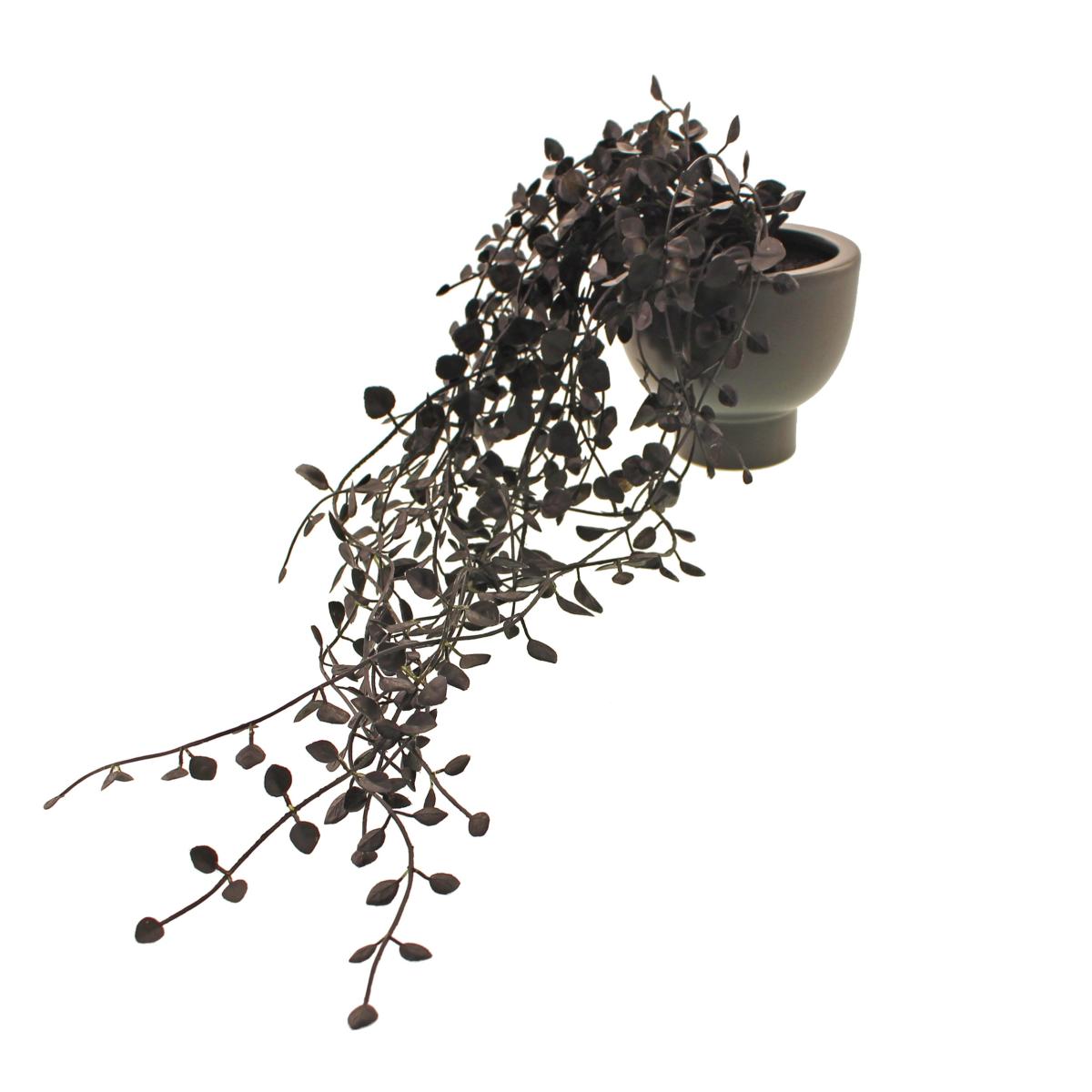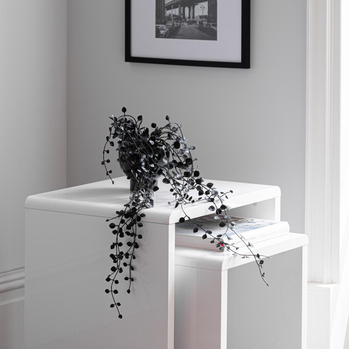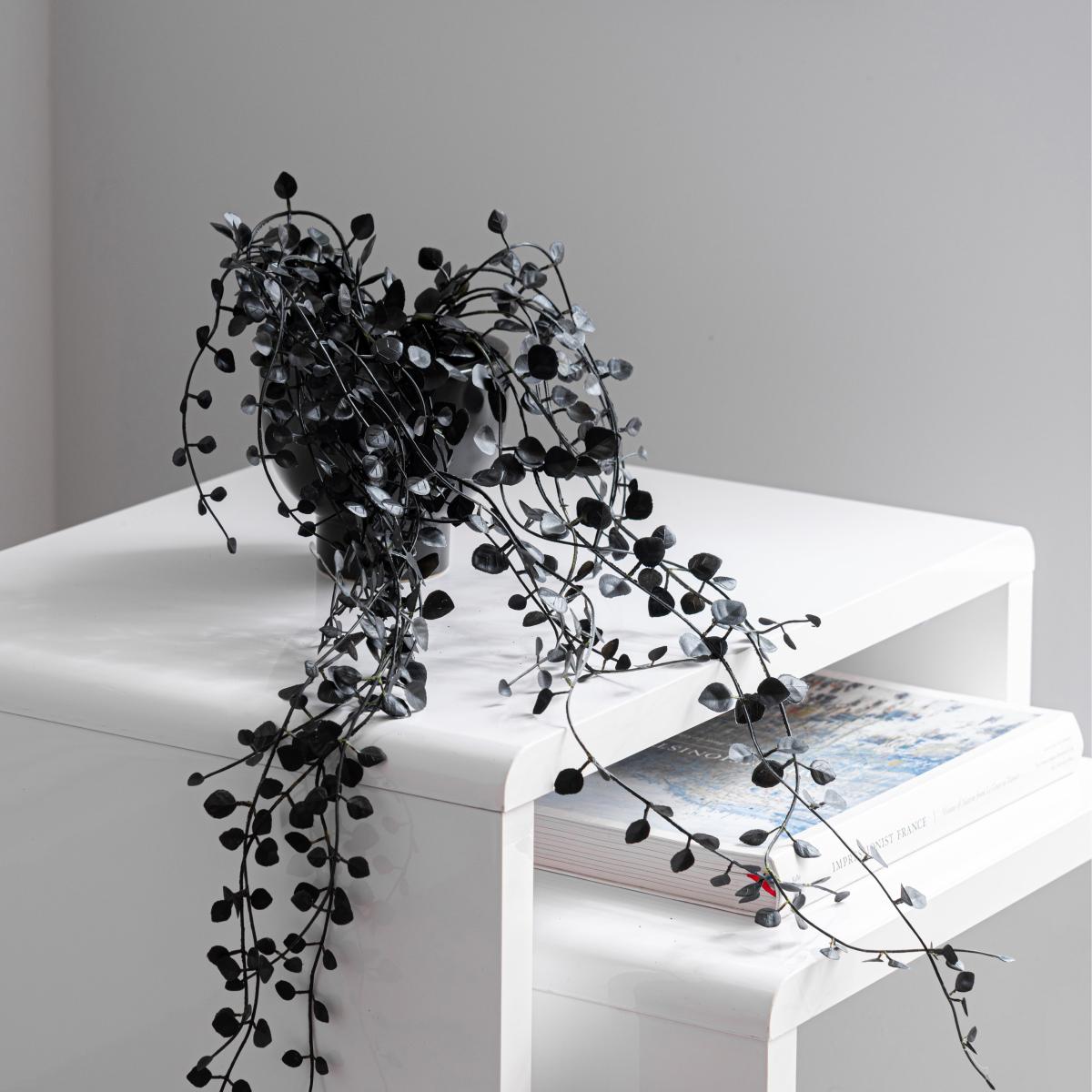I love the artificial trailing black plant for its sleek, modern aesthetic and versatility. Its dark hue can add a sophisticated edge to minimalist interiors, work well in monochrome schemes, or provide a striking contrast in lighter spaces. It’s particularly handy in areas with limited natural light or spaces where real plants might struggle to thrive, such as offices or bathrooms. For styling tips, try placing it on open shelving, top of a sideboard, or cascading over a stack of books to create a relaxed, contemporary look. It pairs wonderfully with metallic accents like gold or matte black accessories, giving any space a polished, curated feel without the upkeep of real greenery.