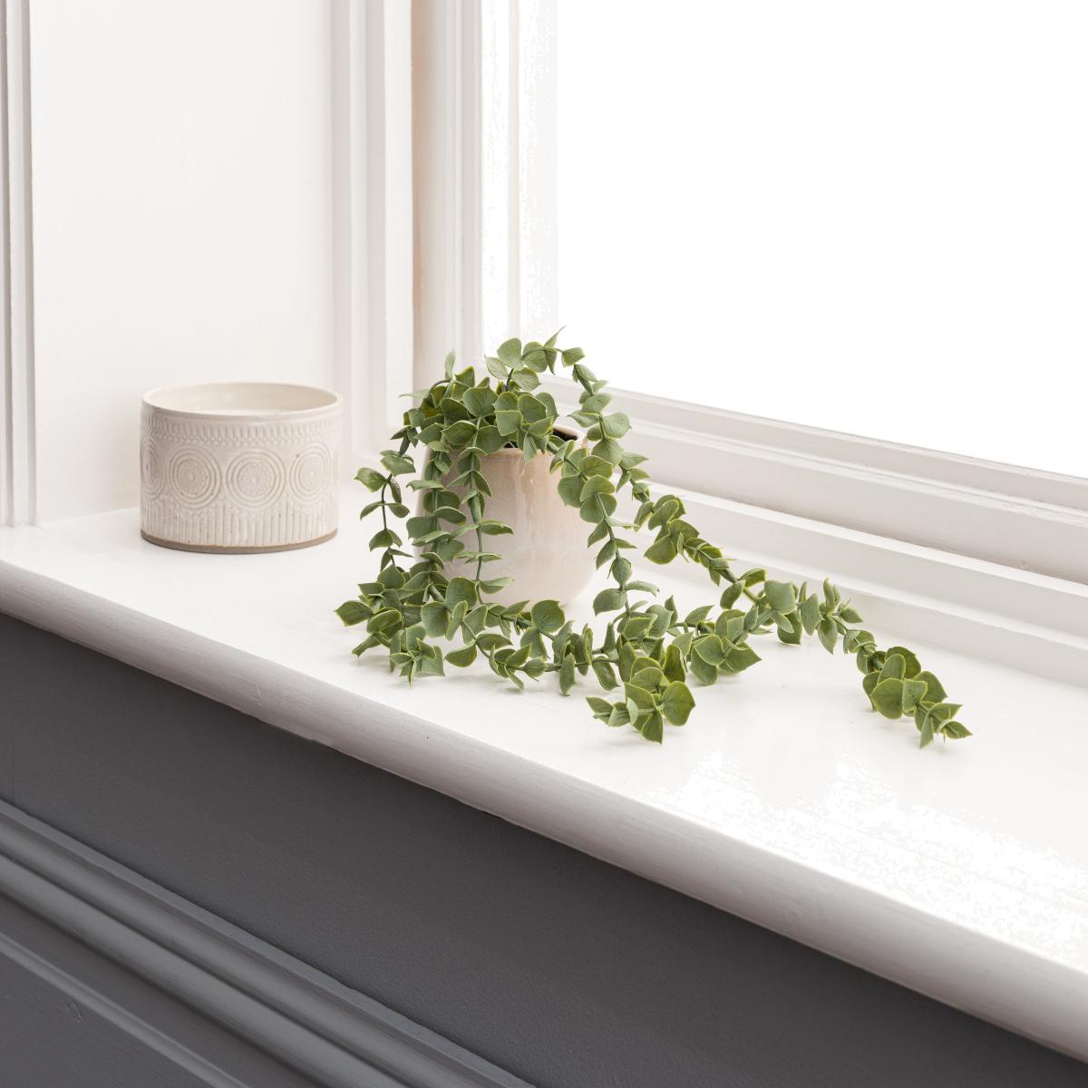 With its contemporary trailing design, this natural look artificial Trailing Eucalyptus plant would brighten up any home with its fresh green colours. Complete with a stylish ceramic vase, this no maintenance plant would make a stunning addition to any home décor.