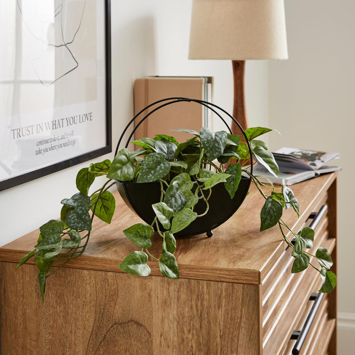 * Artificial trailing plant * Vase made from metal * Indoor use only Enhance your space with this lifelike artificial trailing plant in a sleek round metal vase. Designed for effortless elegance, its lush green foliage adds a touch of nature without the upkeep. Simply wipe clean with a soft cloth to keep it looking fresh.