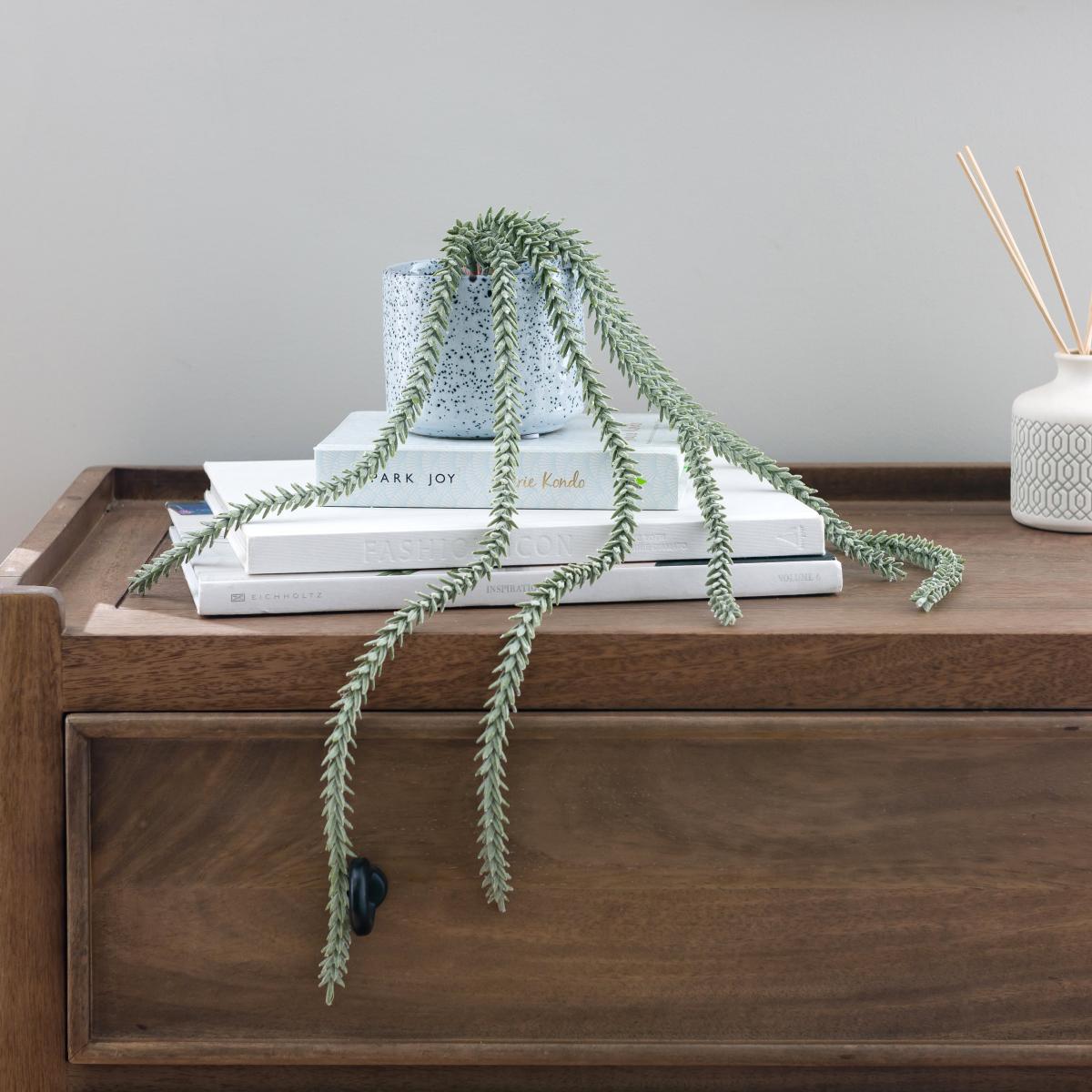 I love the trailing sedum’s versatility; it adds a touch of greenery without the maintenance of real plants. It works really well in contemporary or minimalist interiors, especially when placed in a speckled ceramic pot that adds subtle texture and interest. A practical styling tip is to group it with other faux succulents or grasses to create a lush, layered look on shelves, side tables, or window sills. Its soft, trailing form makes it ideal for softening sharp lines in furniture or framing a space, and because it’s artificial, it’s perfect for bright spots or low-light areas where real plants might struggle. Overall, it’s a simple but effective way to bring some green into any room effortlessly.