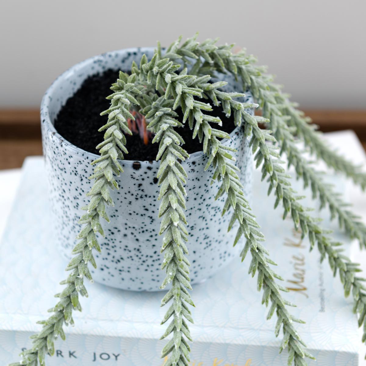 * Year-round greenery * Artificial trailing plant * Speckled ceramic pot * Great for interest and colour No time to care for houseplants? This artificial Trailing Sedum Burros Tail is perfect for those bare corners, bringing realistic life and interest to your living space, with no maintenance or watering required. Complete with a stylish speckled blue ceramic pot, this little plant is ready to be placed wherever you would like to add colour to your home, and will look great throughout the year.