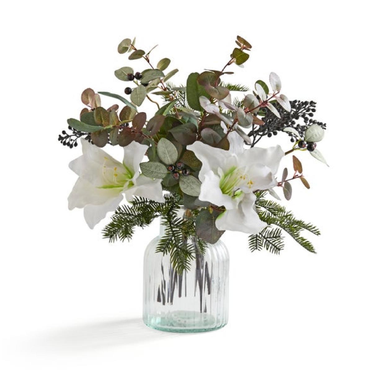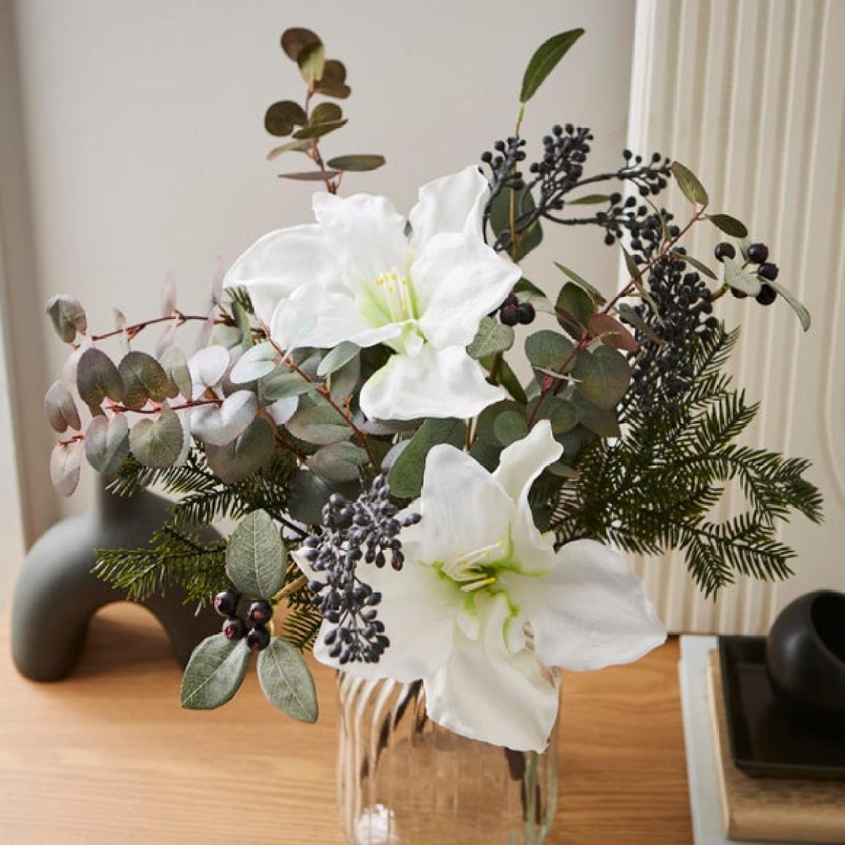 * Rich artificial amaryllis blooms * Fresh white colour * Complementary foliage * Ribbed glass vase included Add a serene touch to your seasonal décor with this Artificial White Amaryllis & Berry Arrangement. Featuring rich amaryllis blooms in a fresh winter white, it’s paired with delicate berries and foliage for a balanced, elegant look. The ribbed glass vase adds texture and sophistication, making it a beautiful addition to mantels, side tables or festive centrepieces. No watering or maintenance needed - just effortless style that lasts. A graceful way to brighten your home through the winter and beyond.