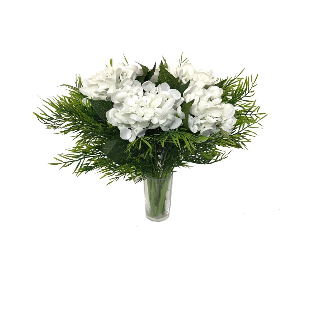Artificial White Hydrangea Flower and Fern Arrangement - White and Green