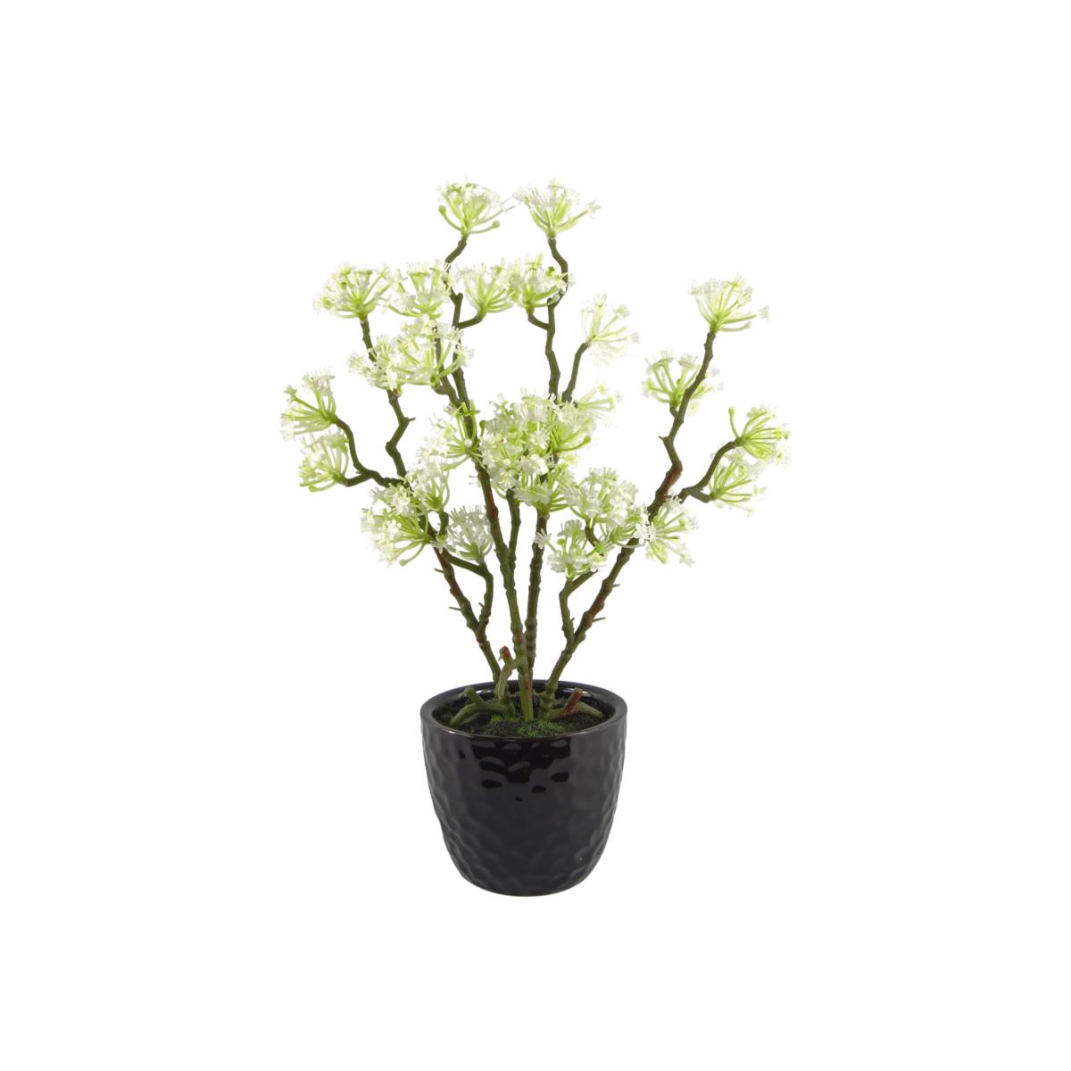 Part of our range of realistic plants and floral arrangements this mini blossom plant looks great on a desk or window sill. It is fixed into the supplied planter with a realistic soil effect finish. Stems are wired and can be shaped to your requirements. It comes potted in a black ceramic planter and is ready to display. Recommended for indoor only use.