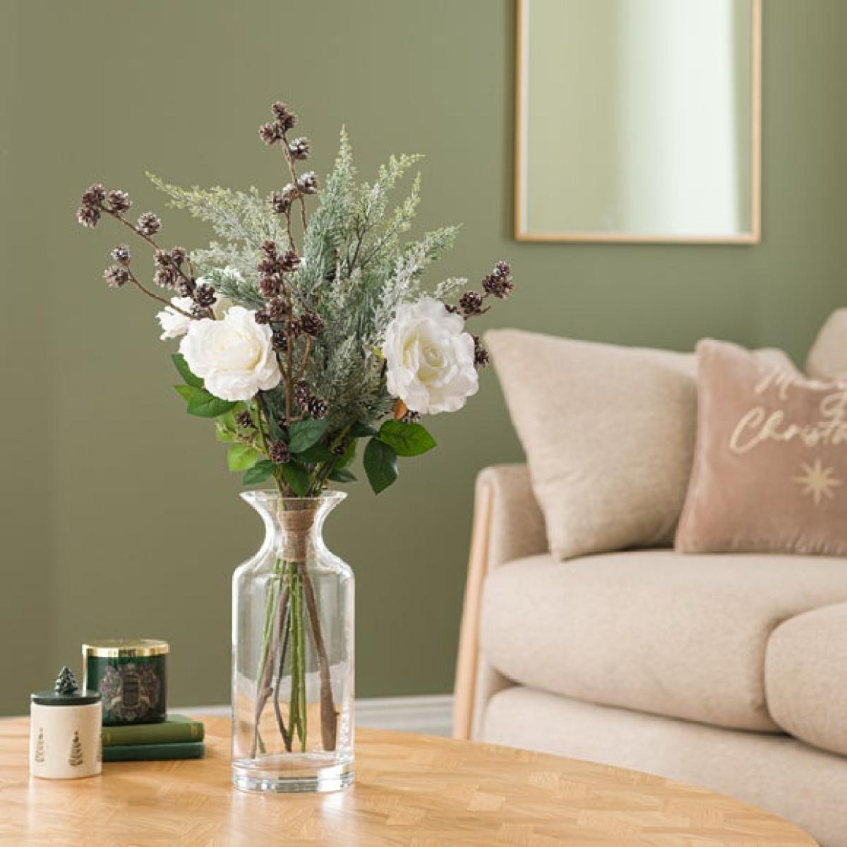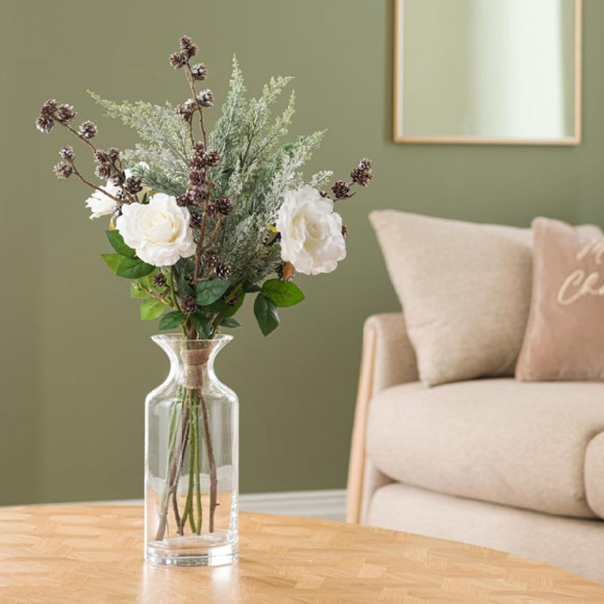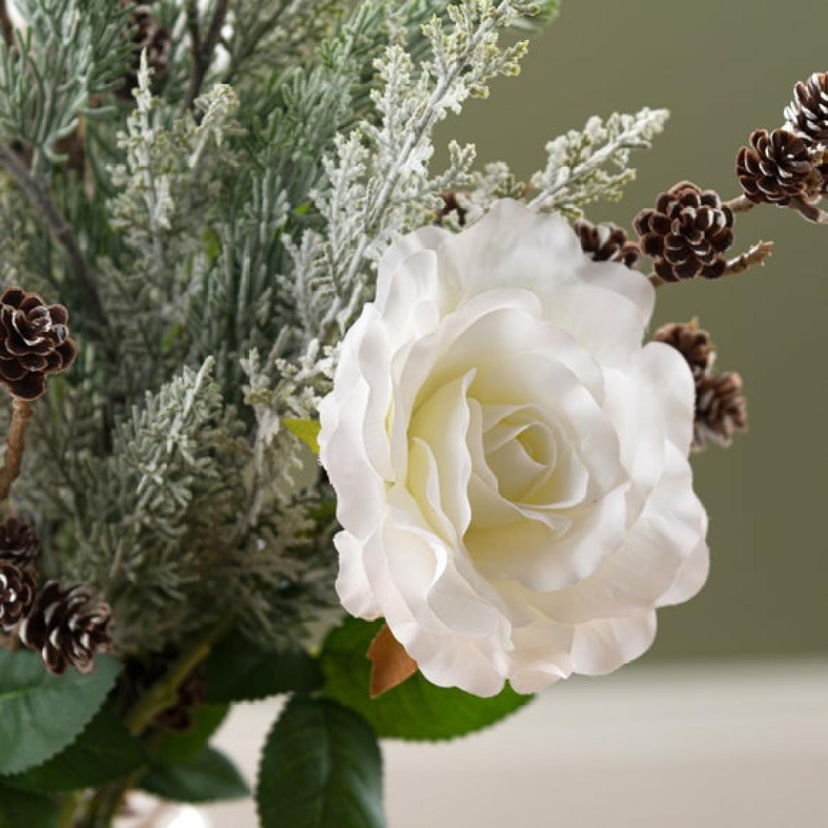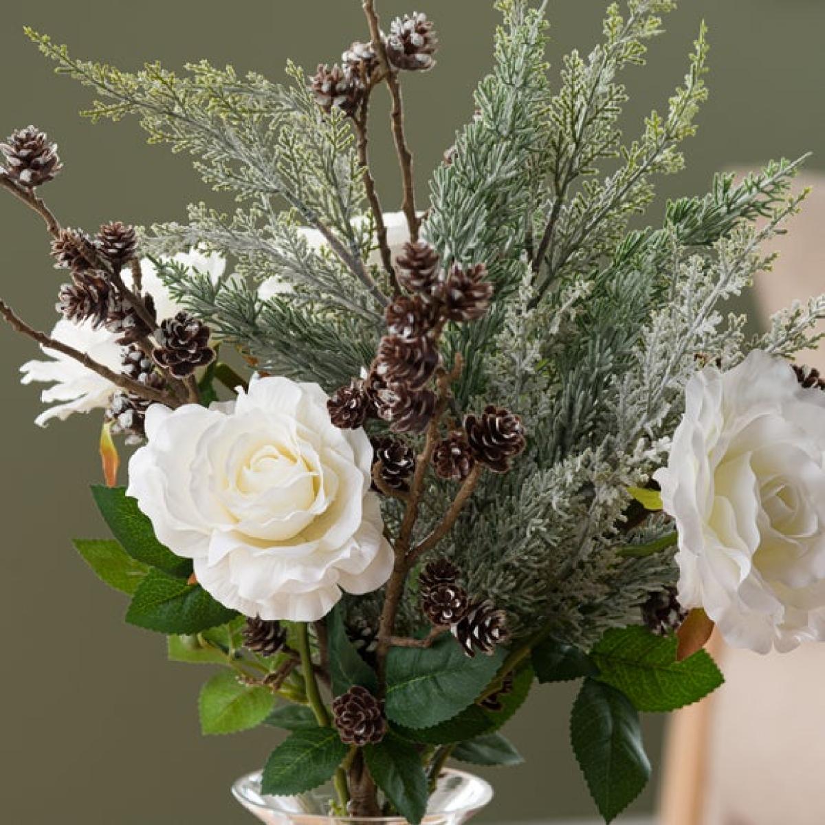 * Artificial bouquet * Fresh, white roses * Green fir foliage * Pinecones for texture * Vase not included Bring winter elegance indoors with this beautiful artificial white rose, fir and pinecone bouquet. Fresh white roses are paired with deep green fir foliage and natural pinecones for a textured, seasonal finish. Its realistic design offers all the style of a festive arrangement without the maintenance - perfect for creating a stylish table centrepiece or enhancing any interior display. Vase not included, giving you the freedom to style it your way. A timeless piece to enjoy throughout the season.