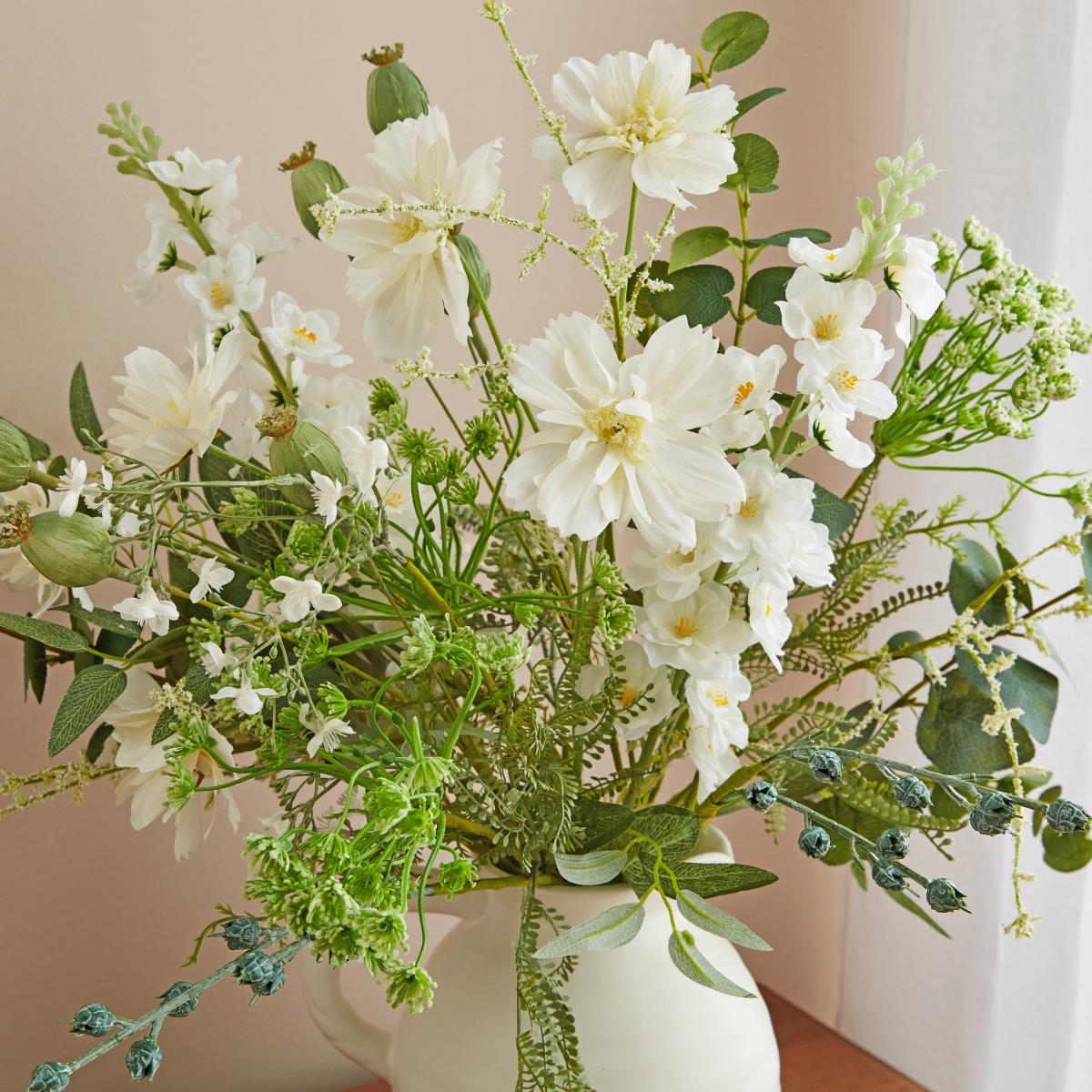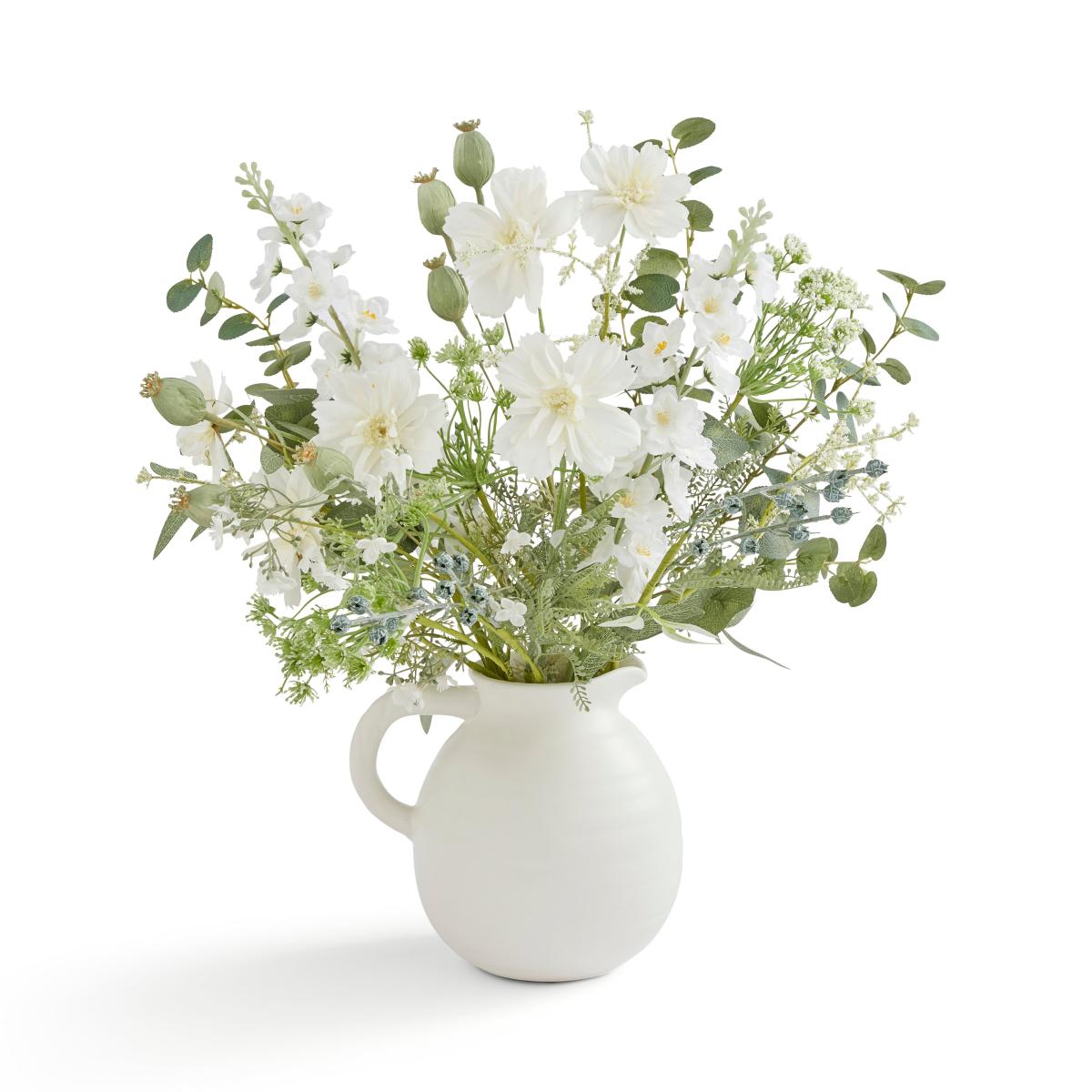 * Artificial Bouquet * Includes Wildflower & Eucalyptus * Displayed in Cream Ceramic Jug Vase * Requires No Maintenance Displayed in a ceramic cream-coloured jug with soft, curved edges and a gentle, graceful spout, this artificial bouquet is filled with wildflowers and eucalyptus - arranged as if you'd hand-picked them yourself!