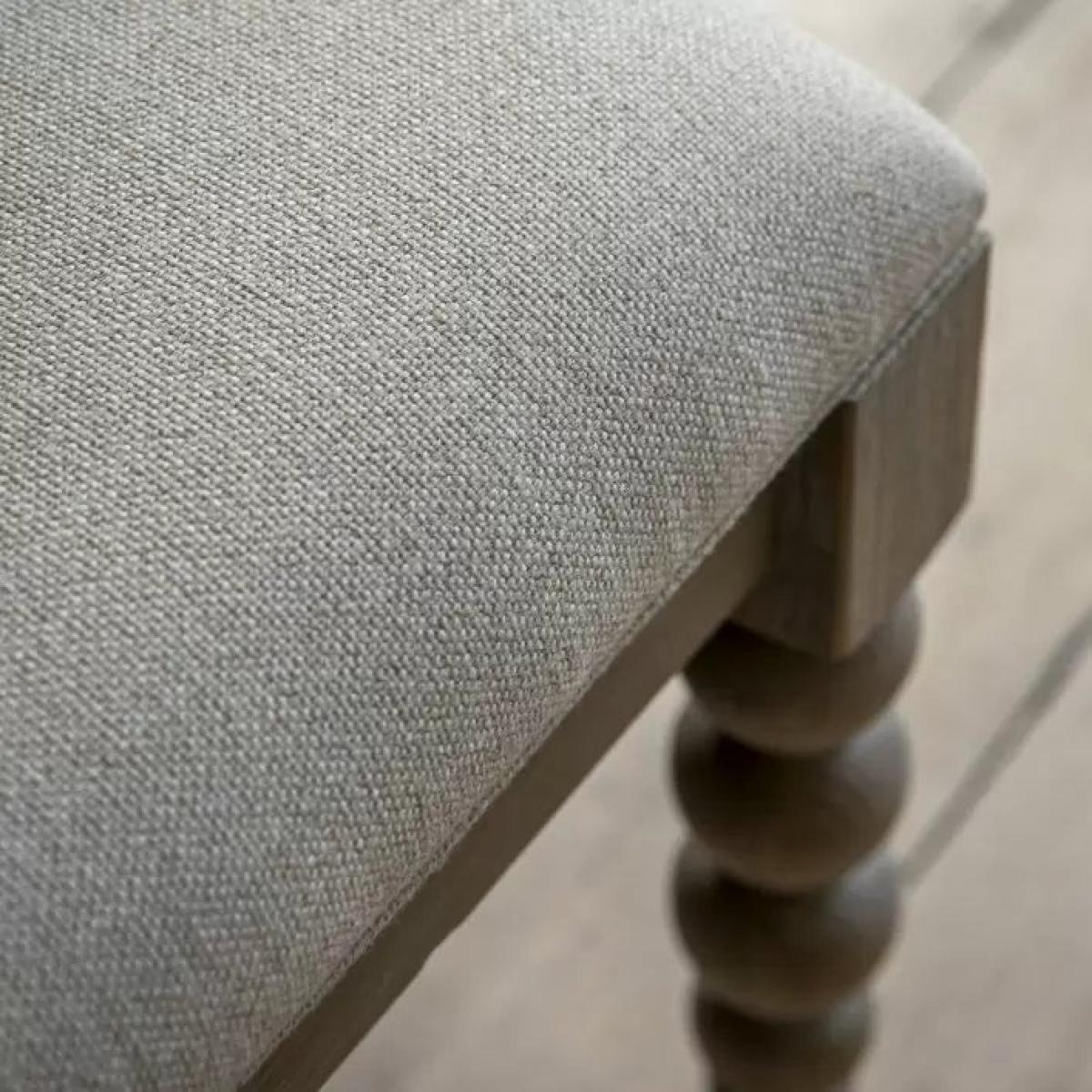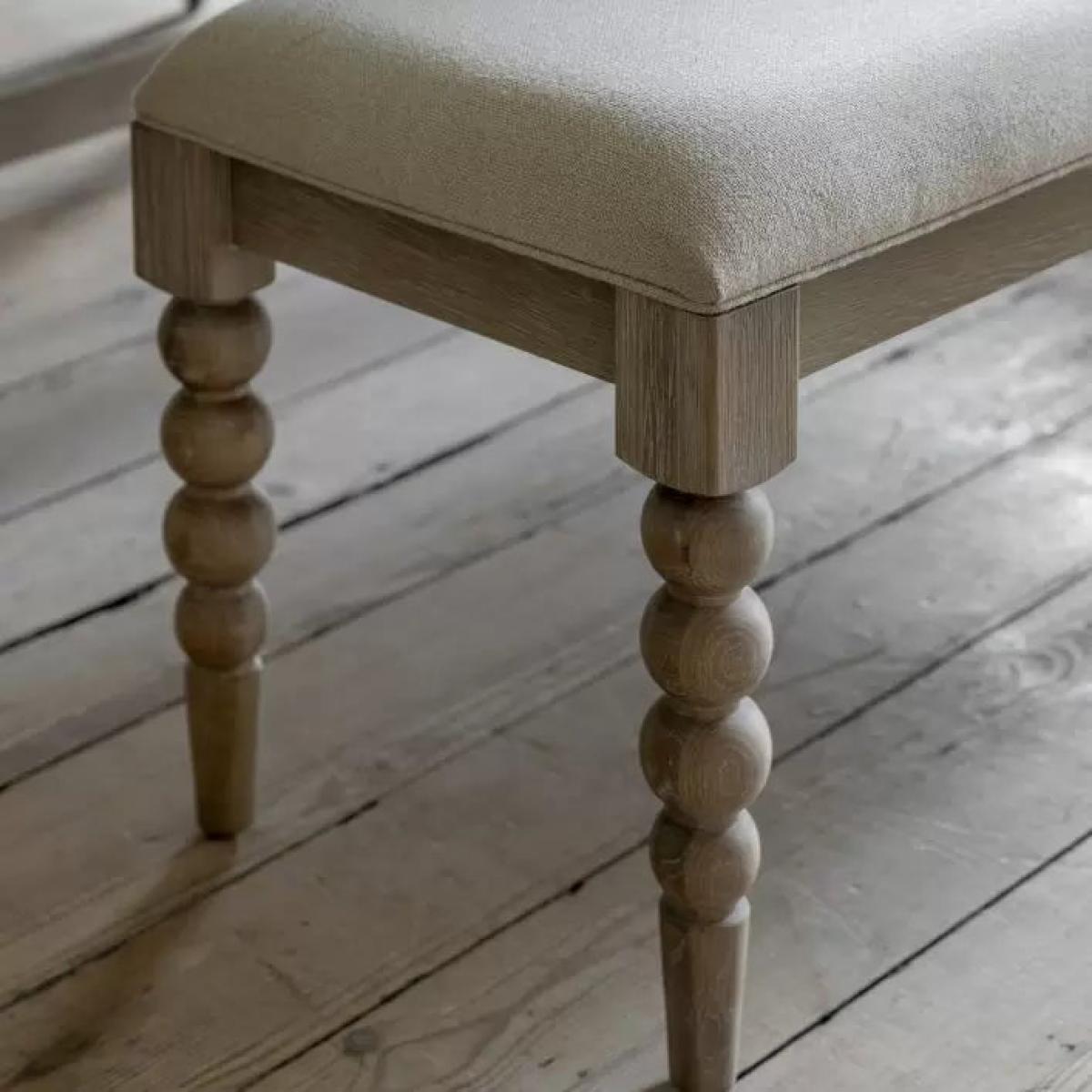The eye-catching legs on this beautiful dining bench feature hand-crafted bobbin detail which is created by turning the wood on a lathe, a task carried out by the finest craftsmen. The bench is made from oak with a very subtle lime wash tone to the finish which is soft and mellow, paired with biscuit coloured fabric for the upholstered seat. Matching pieces are available.