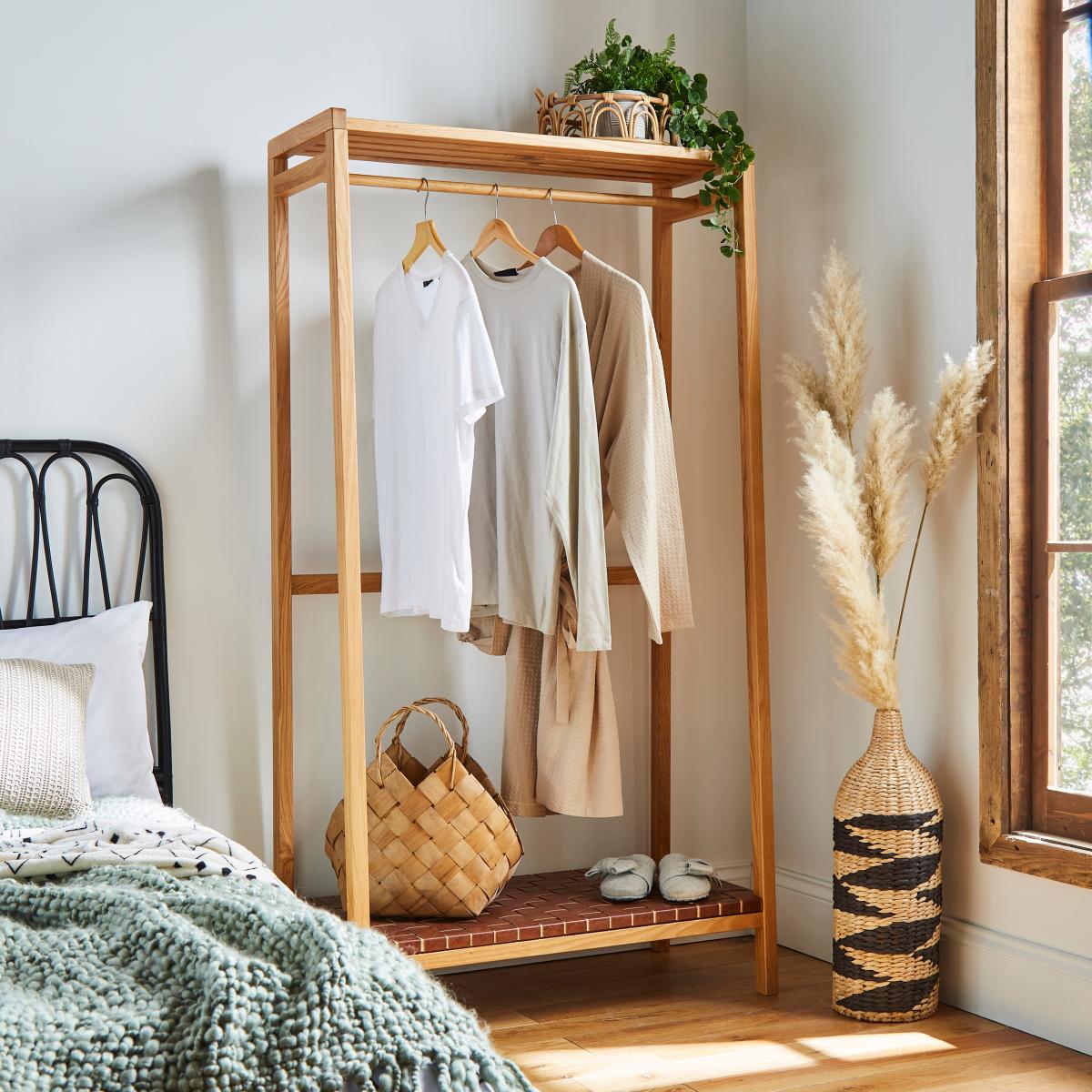 Our Artisan Clothes Rail is a sleek and stylish addition to the home. With solid ash wood and a woven faux leather shelf, this clothes rail is easy to assemble and will look great in any room of the house.